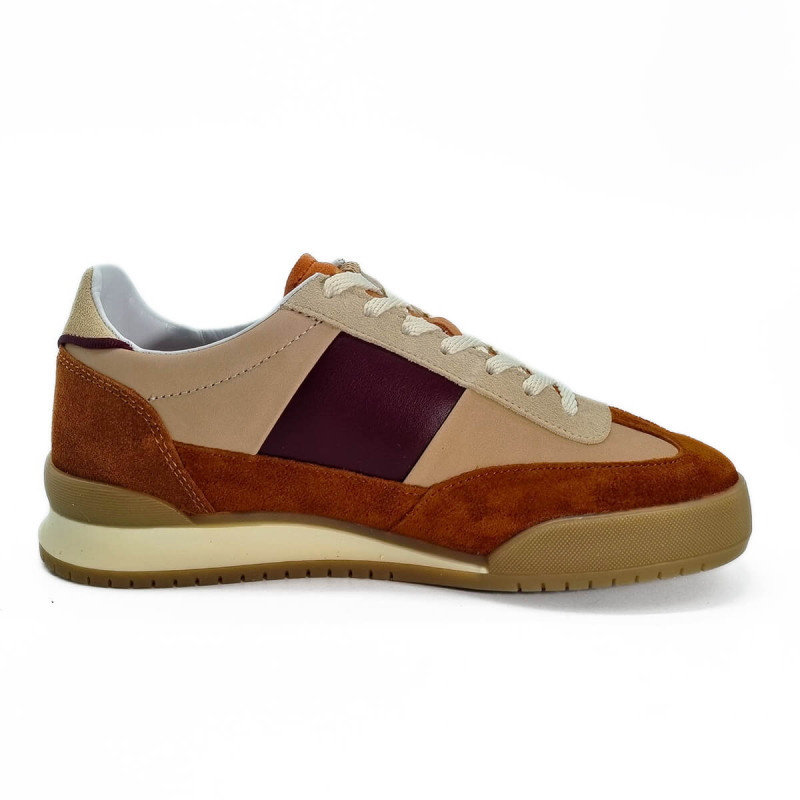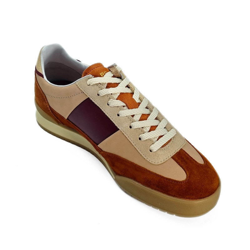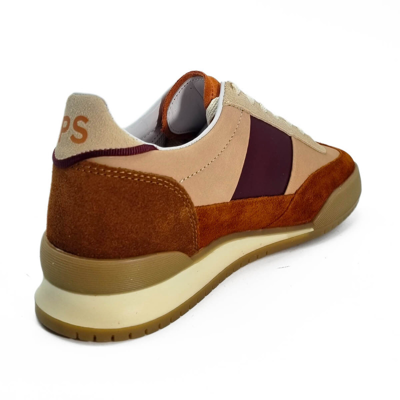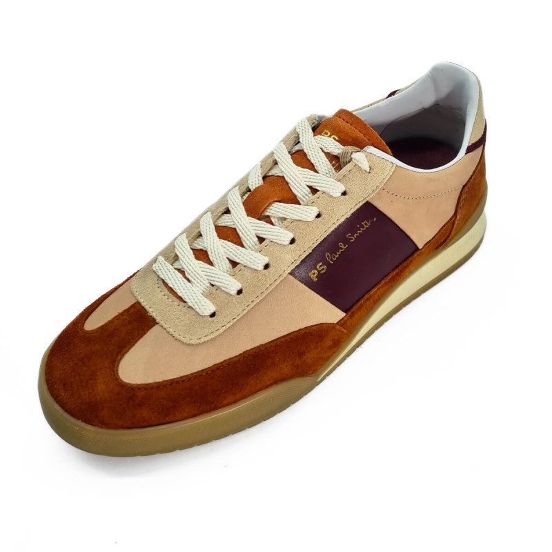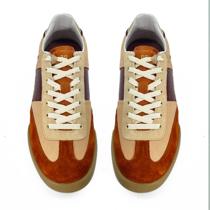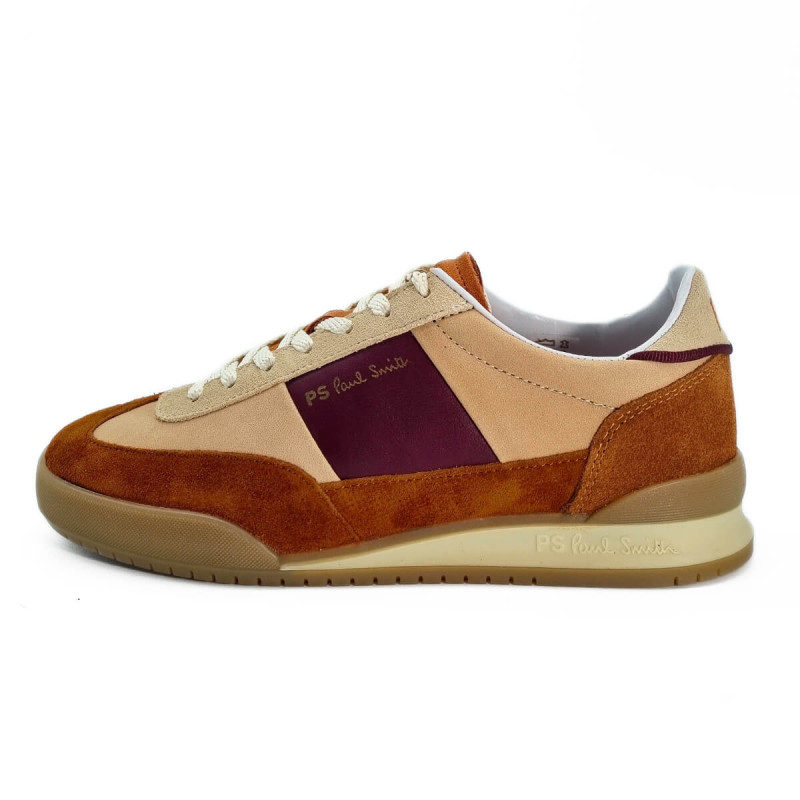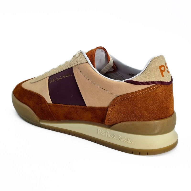 Optez pour la basket Paul Smith Dover pour femme, un mélange d'élégance et de confort. Son daim rouille chaleureux s'harmonise avec des empiècements en cuir rose pâle, rehaussés d'une touche de bordeaux sophistiqué.