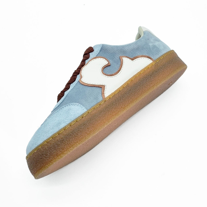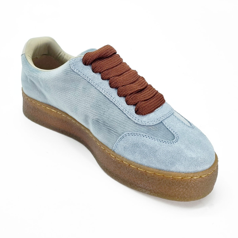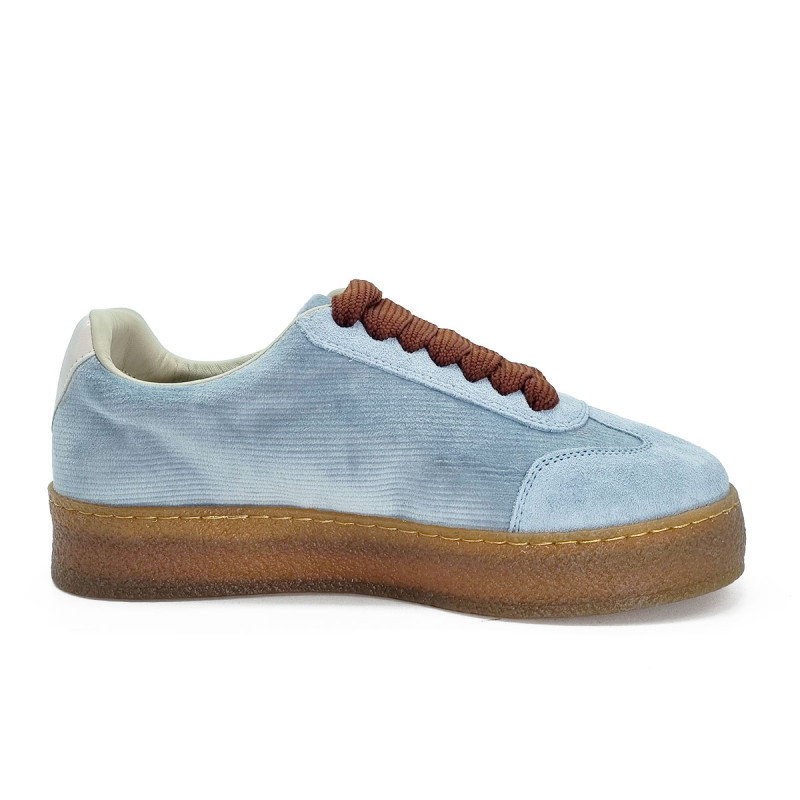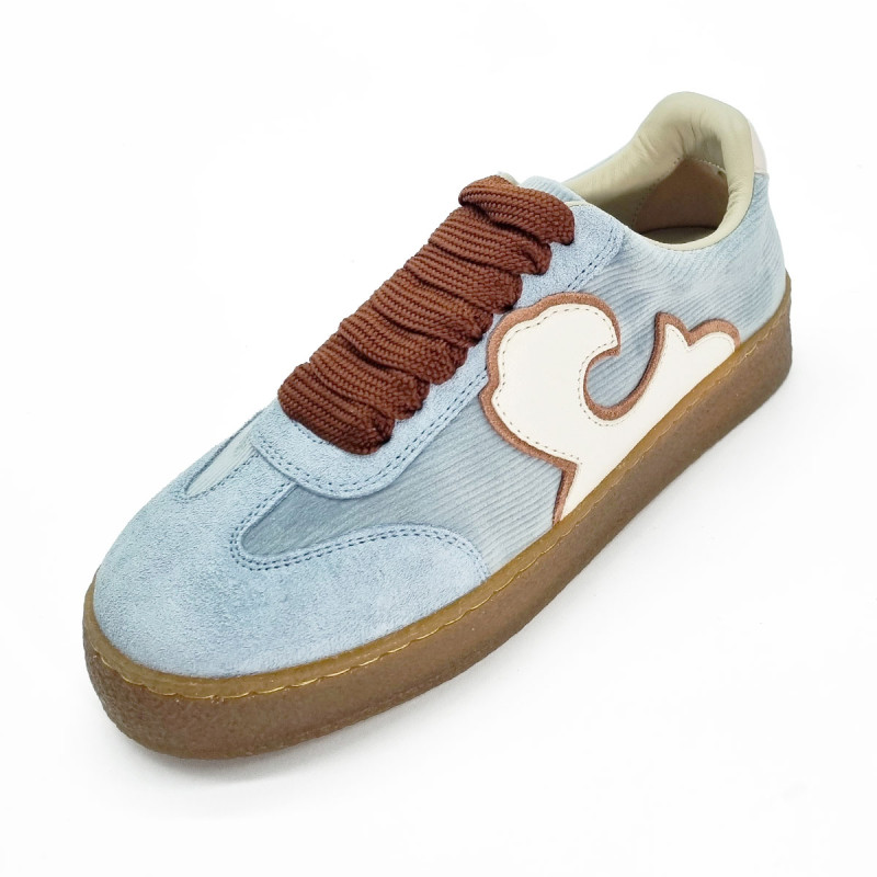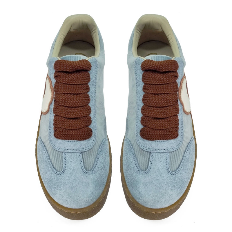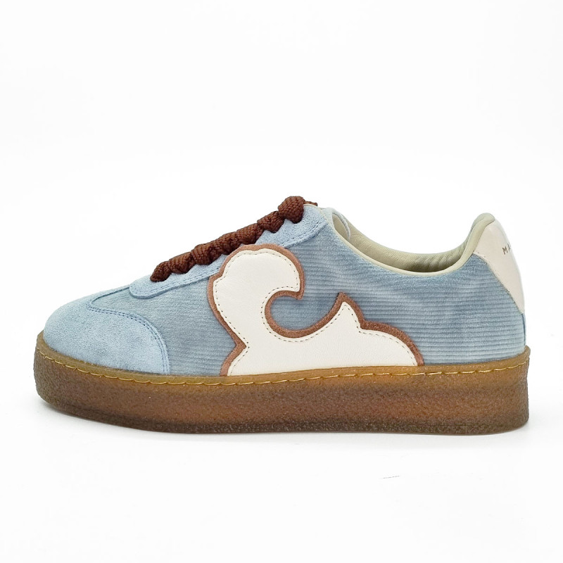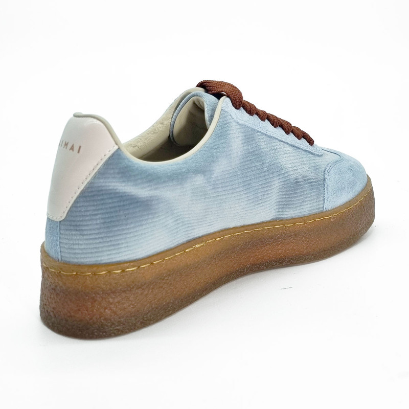 Cette basket Maïmaï associe une silhouette classique à un esprit rétro ultra tendance. Confectionnée en velours côtelé bleu ciel avec empiècement crème contrastant, elle repose sur une semelle gomme confortable. Les lacets marron apportent une touche chaleureuse à ce modèle tout en douceur.
