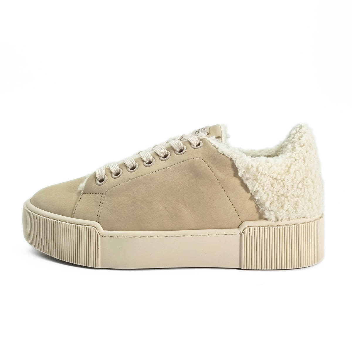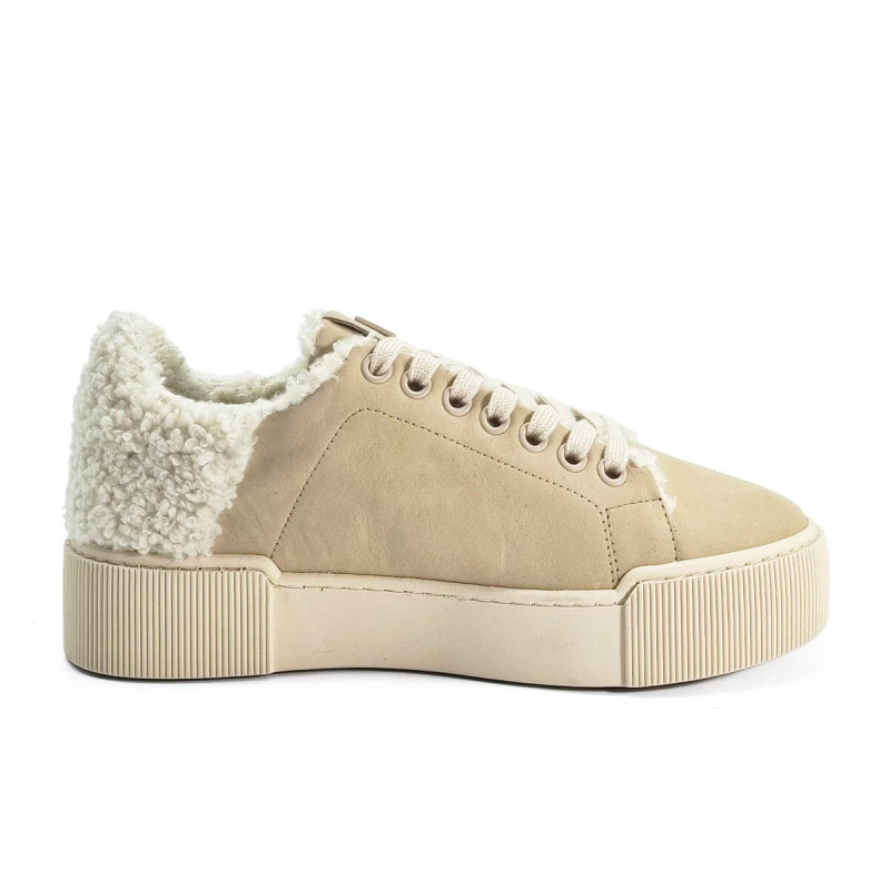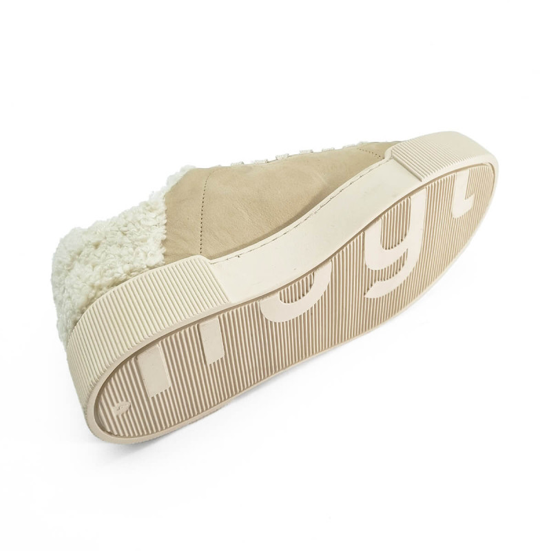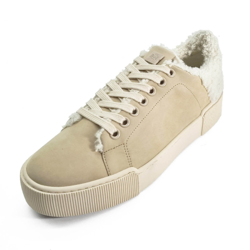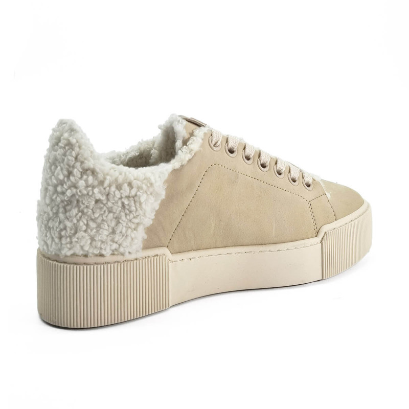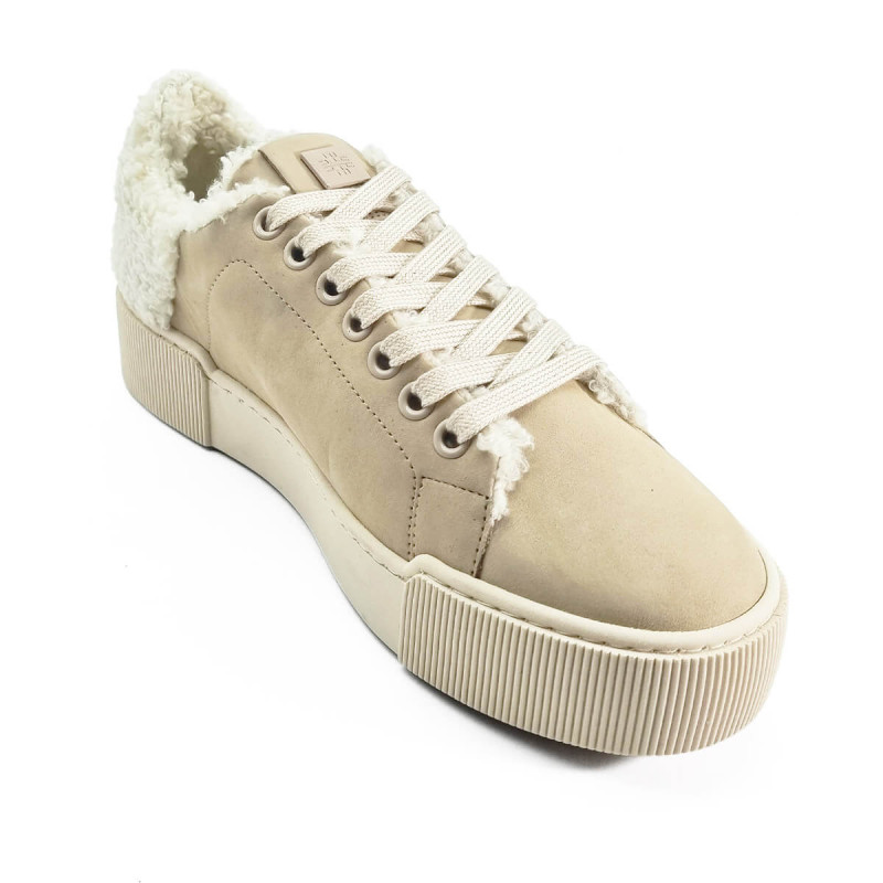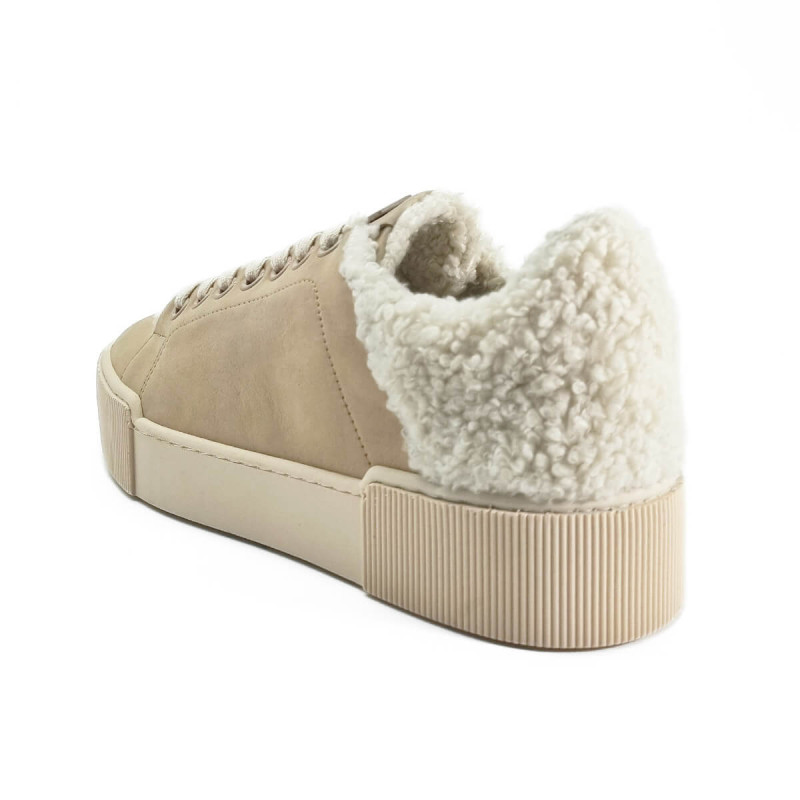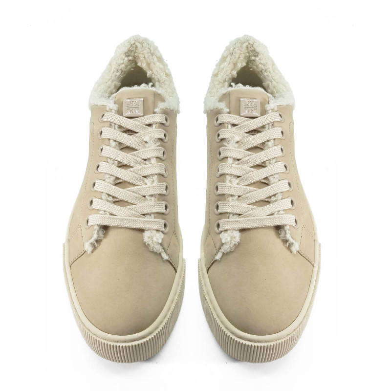 Cette basket en nubuck beige de la marque Hogl séduit par son design moderne et sa touche cosy avec l’arrière en laine bouclée. Confortable et tendance, elle se porte facilement au quotidien avec un jean ou une tenue décontractée chic.