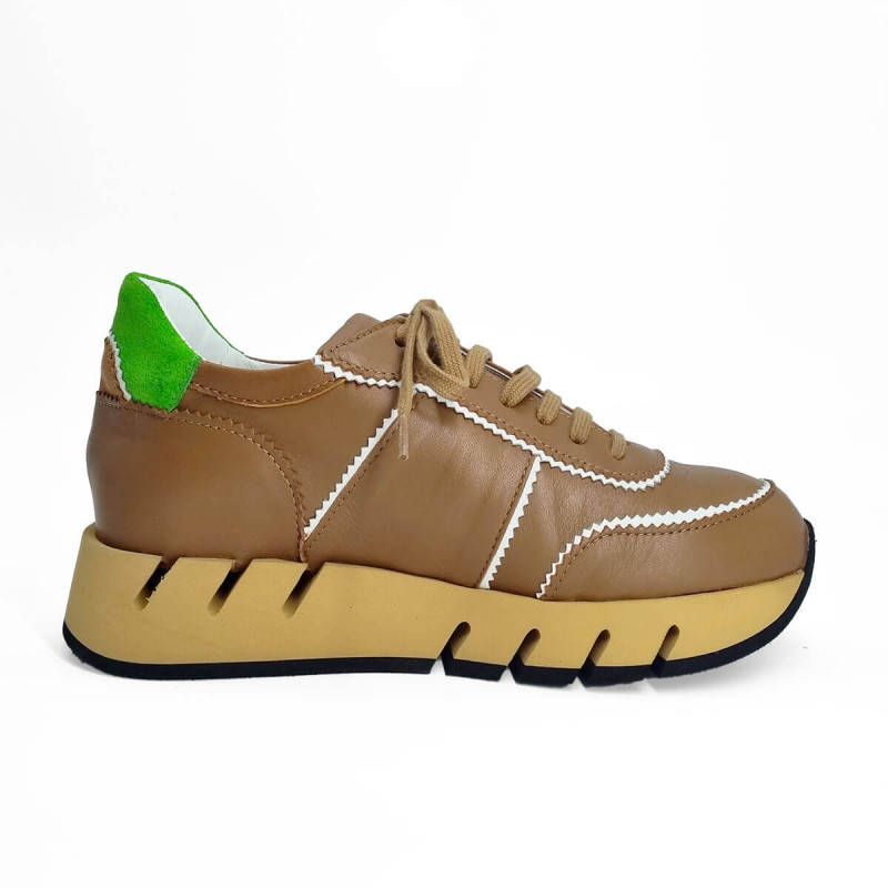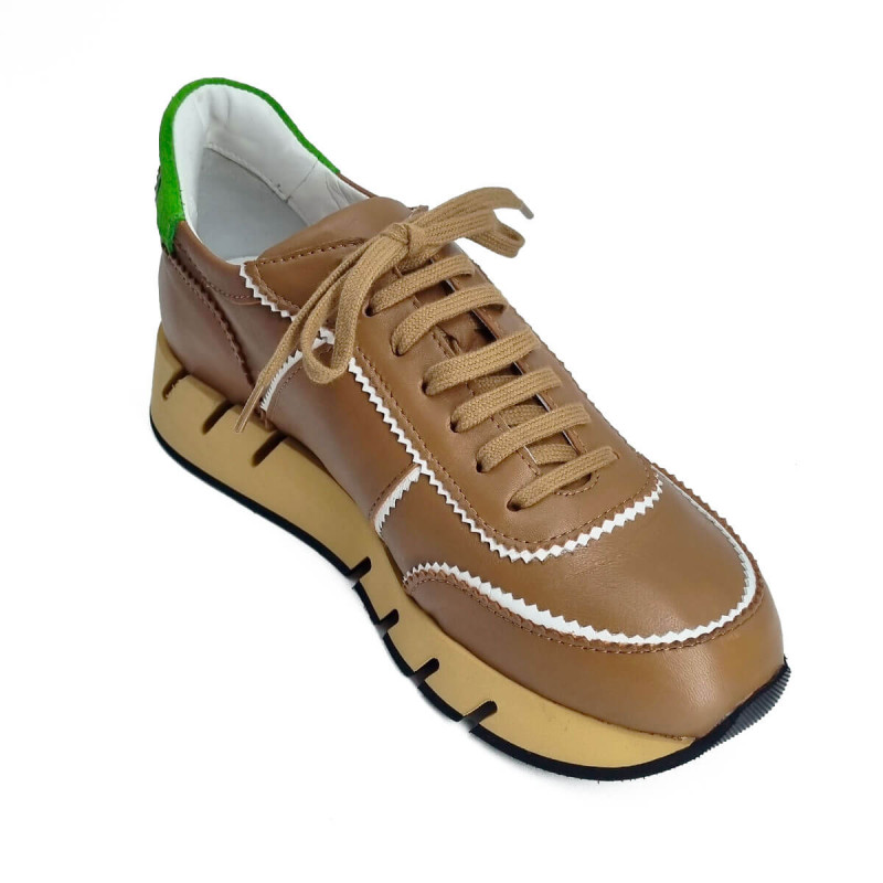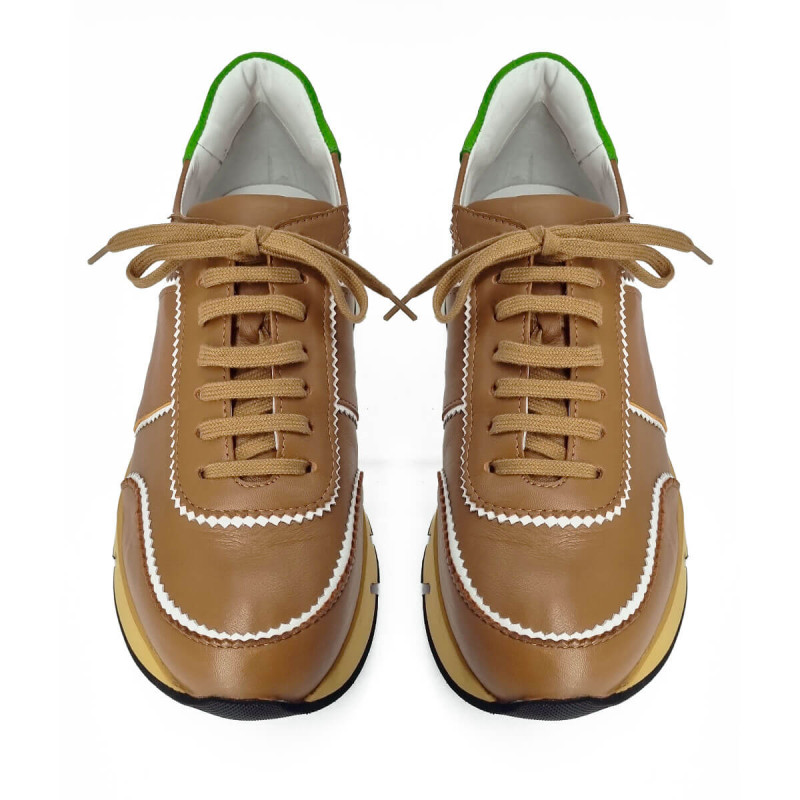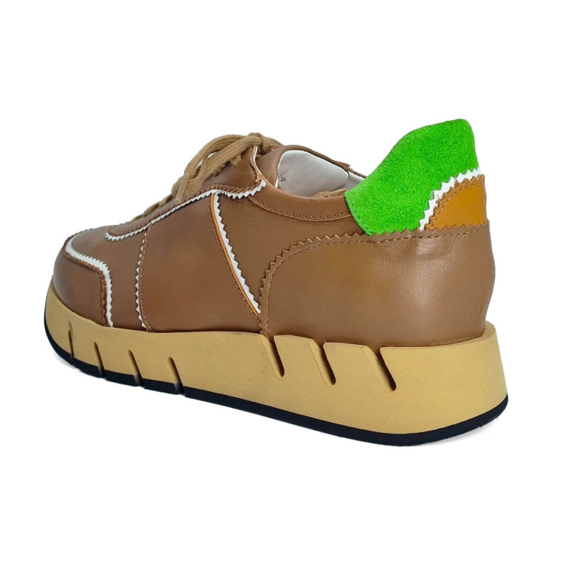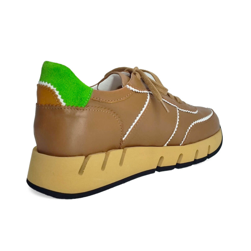 Basket stylée en cuir camel relevée d’un liseré blanc pour un contraste élégant. La tige arrière verte apporte une touche de fraîcheur et de peps. Un modèle tendance pour dynamiser vos tenues du quotidien.