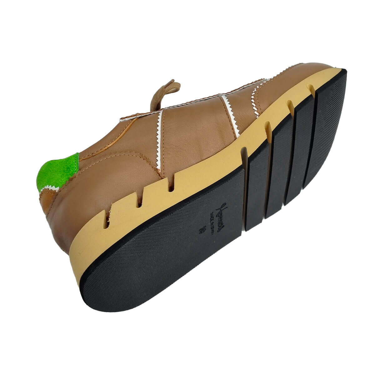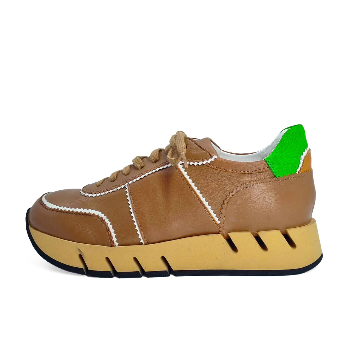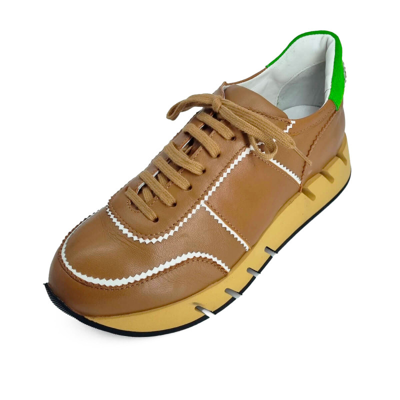 Basket stylée en cuir camel relevée d’un liseré blanc pour un contraste élégant. La tige arrière verte apporte une touche de fraîcheur et de peps. Un modèle tendance pour dynamiser vos tenues du quotidien.