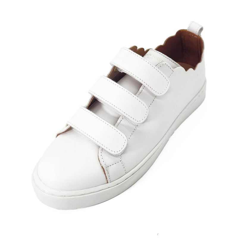 La basket Julianne Maison Toufet séduit par son design moderne et minimaliste. Confectionnée en cuir blanc, elle se distingue par sa fermeture à trois scratchs sur le devant, à la fois pratique et originale. Les découpes à la cheville apportent une touche graphique et contemporaine à ce modèle facile à porter au quotidien.