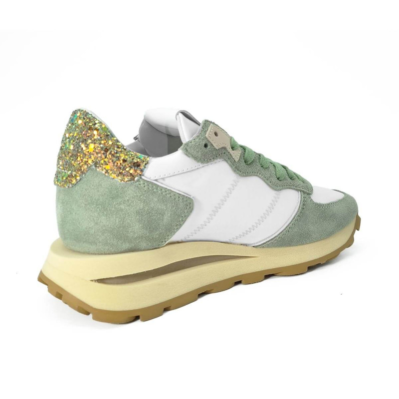 La basket Tropez signée Philippe Model séduit par son mélange de daim vert et textile pour un esprit sport chic affirmé. Son contrefort arrière orné de strass apporte une touche lumineuse et féminine. Un modèle tendance qui associe allure urbaine et confort au quotidien.