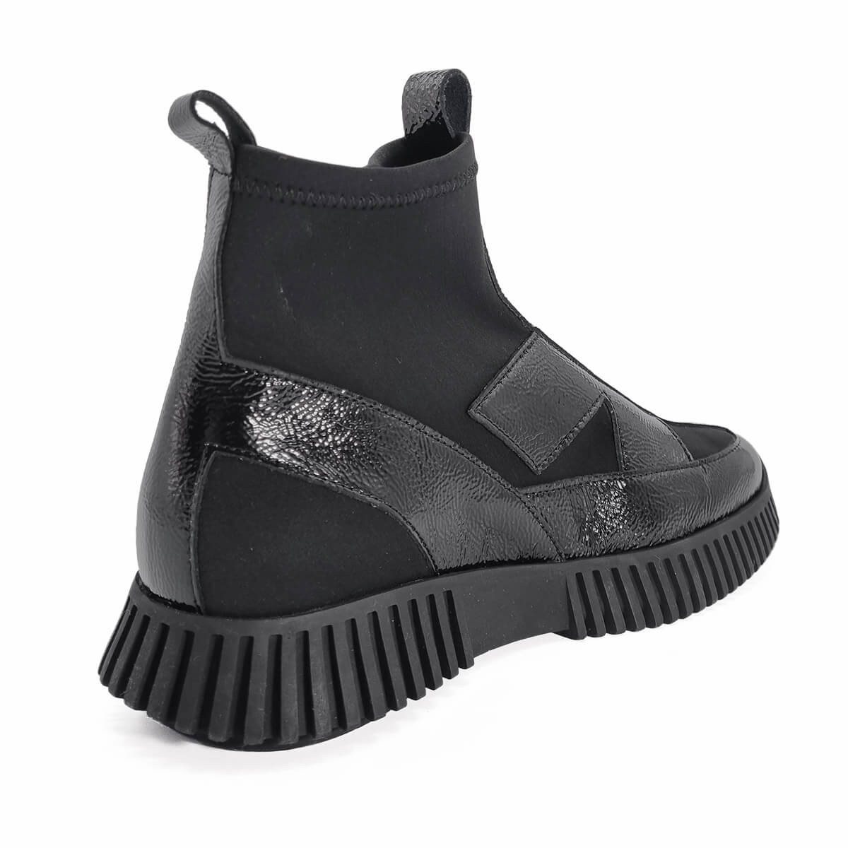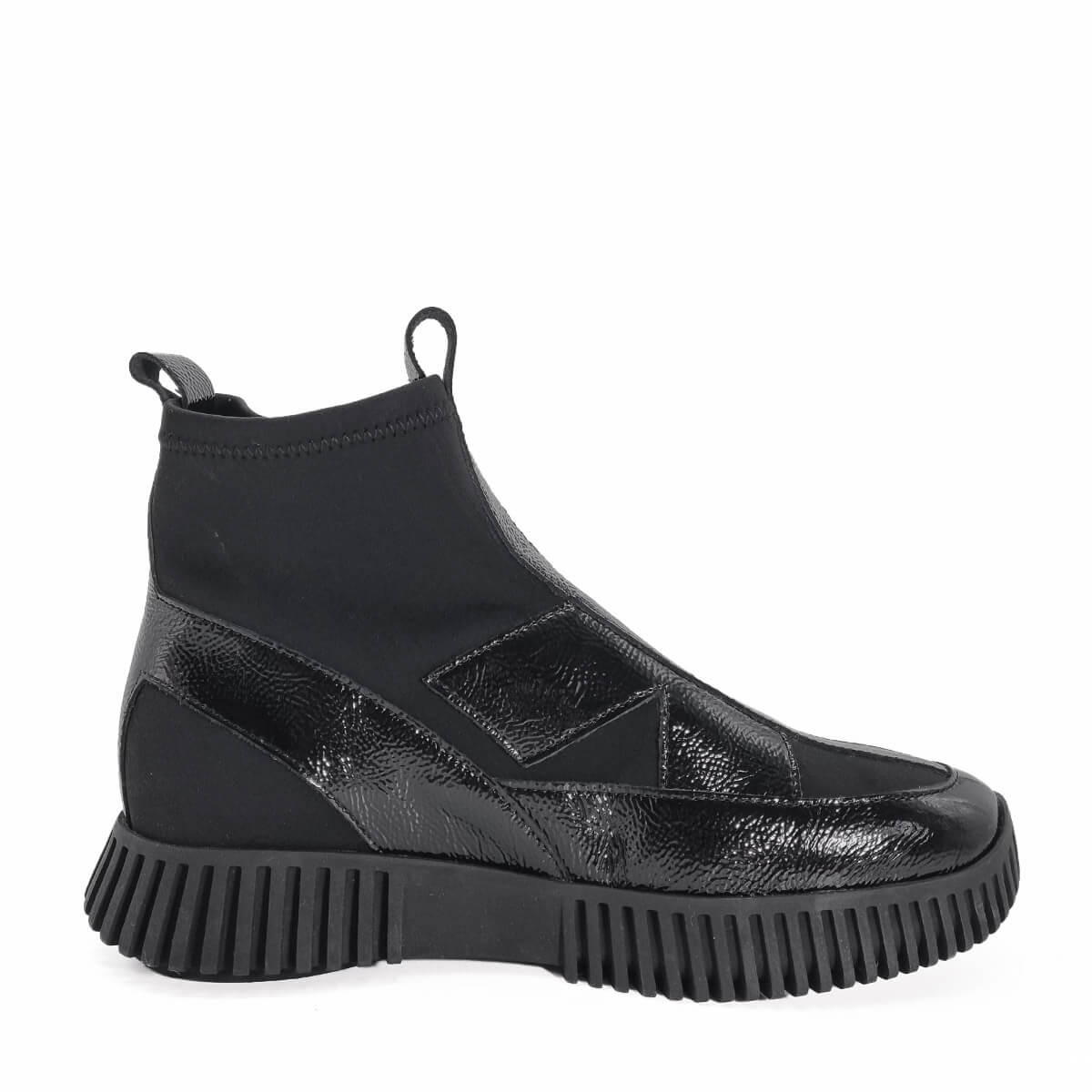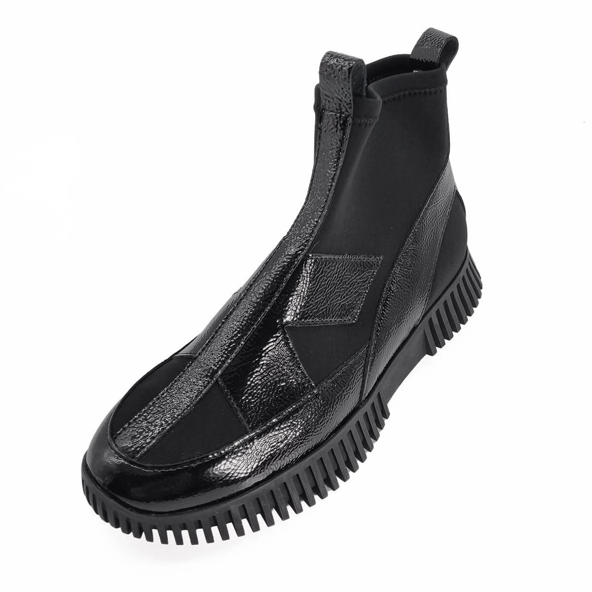 Audacieuse et contemporaine, cette bottine Arche marie avec élégance un tissu stretch noir et des empiècements en cuir vachette vernis pleine fleur. On aime son design architectural, alliance parfaite entre création moderne et raffinement français.