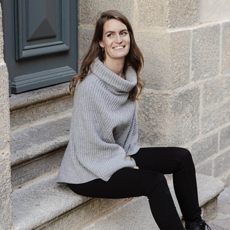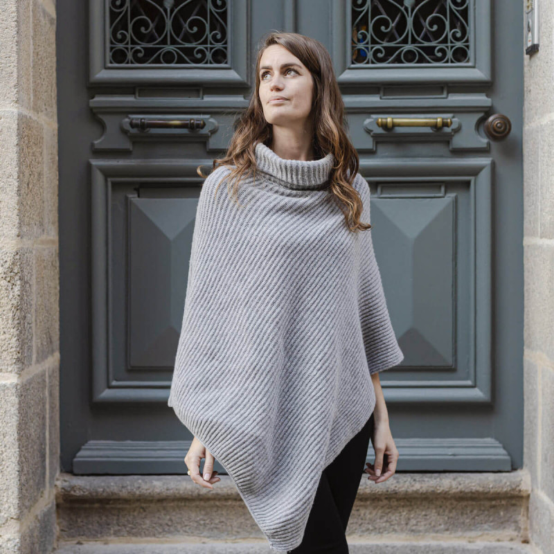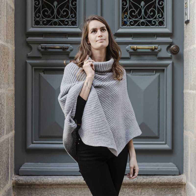 Poncho gris tricoté à la main par Léa Clément, mêlant laine et cachemire pour une douceur exceptionnelle. Son col roulé protège efficacement du froid. Les touches de laine grise ajoutent contraste et modernité. Une pièce chaleureuse, idéale pour l’hiver.