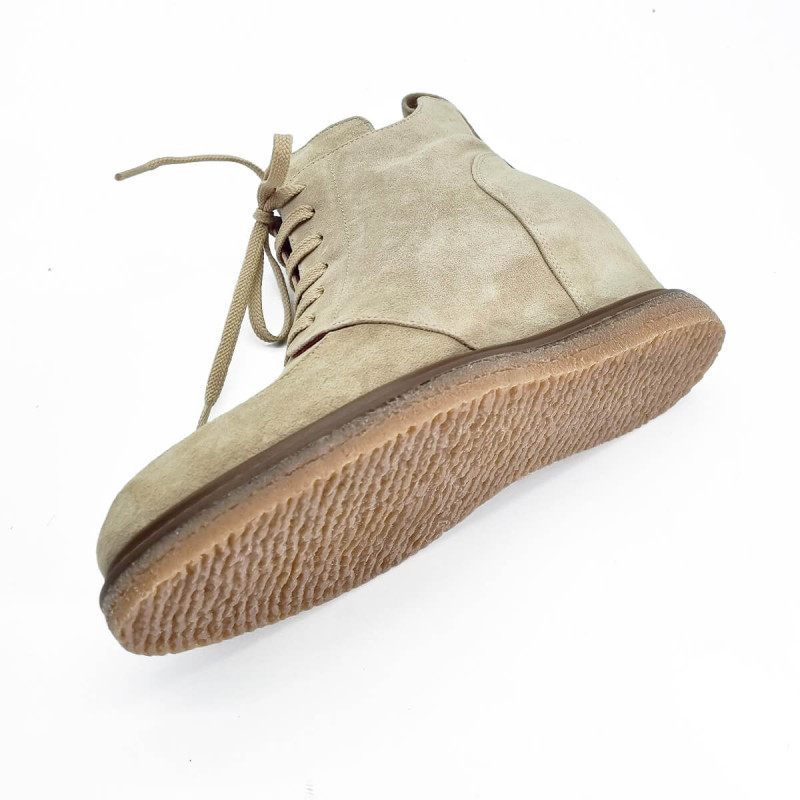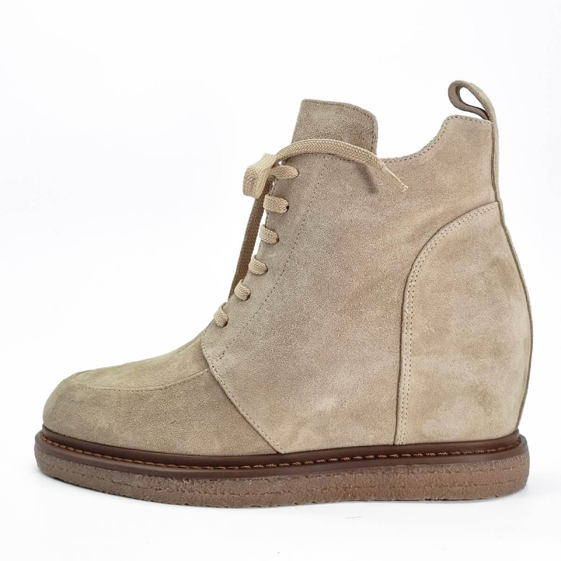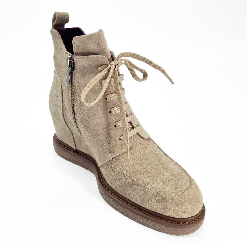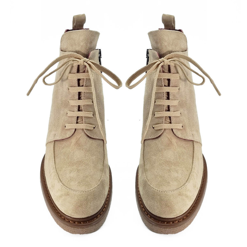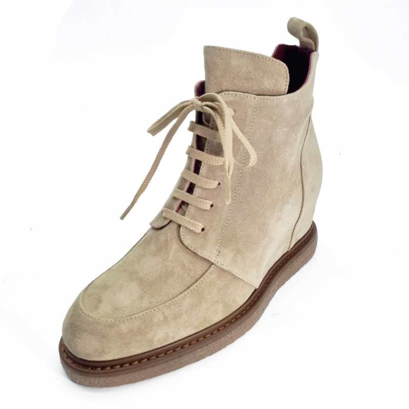 Élégante et intemporelle, cette bottine à talon compensé se distingue par son empiècement unique en daim beige, doux et raffiné. Les lacets apportent une touche de modernité tout en assurant un maintien parfait du pied.