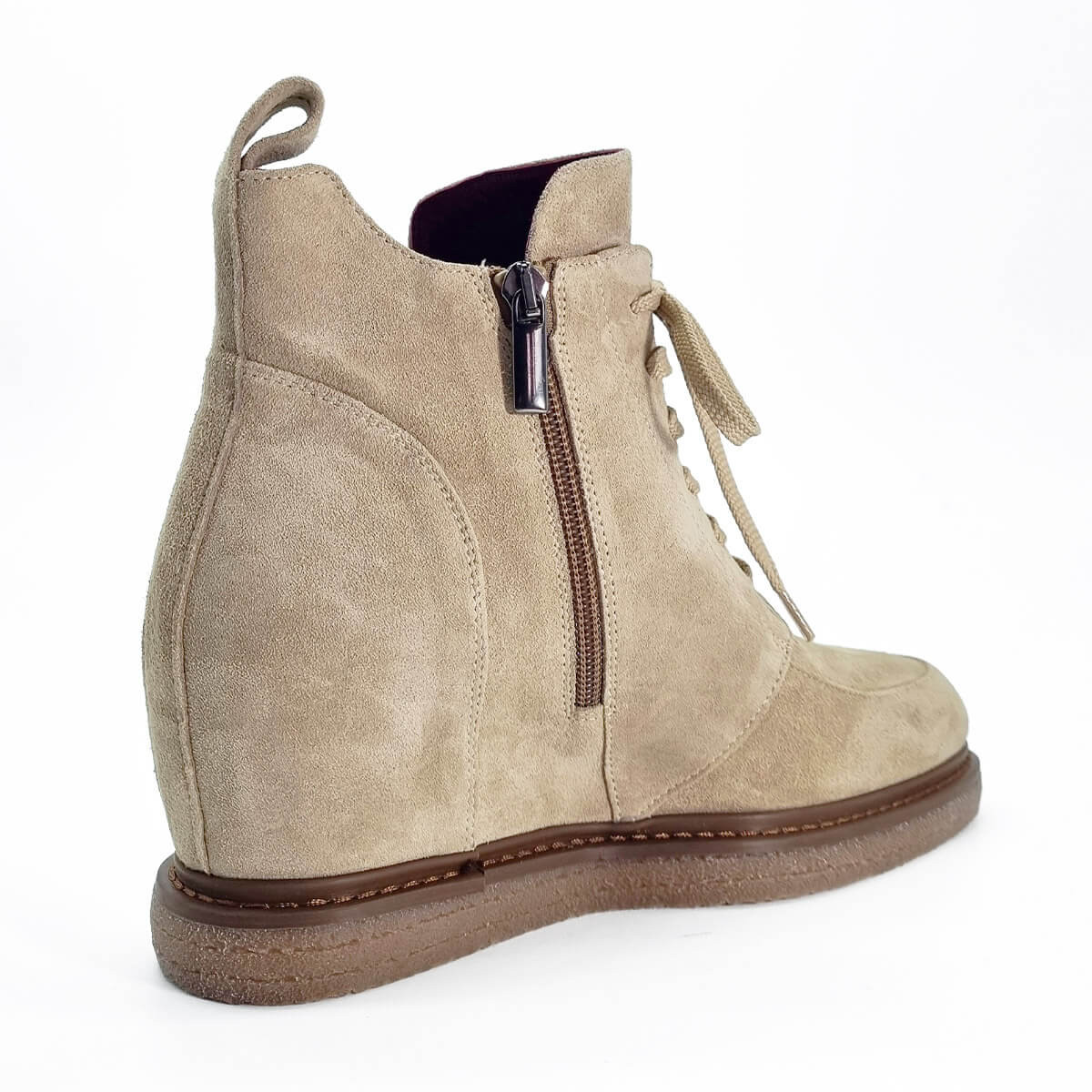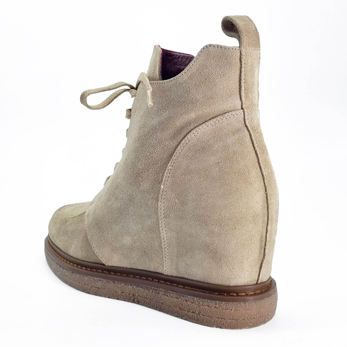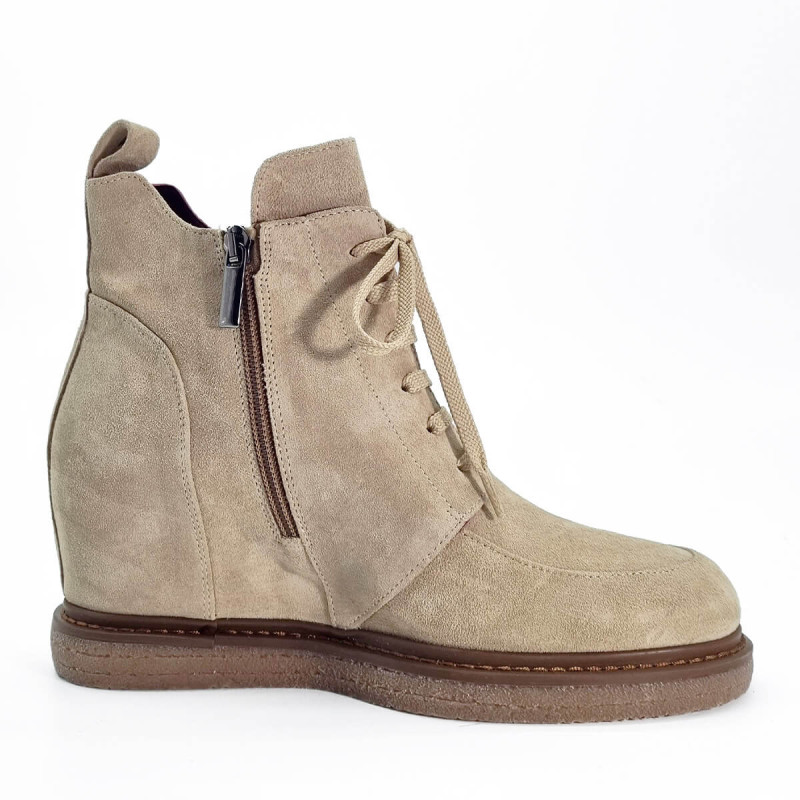 Élégante et intemporelle, cette bottine à talon compensé se distingue par son empiècement unique en daim beige, doux et raffiné. Les lacets apportent une touche de modernité tout en assurant un maintien parfait du pied.