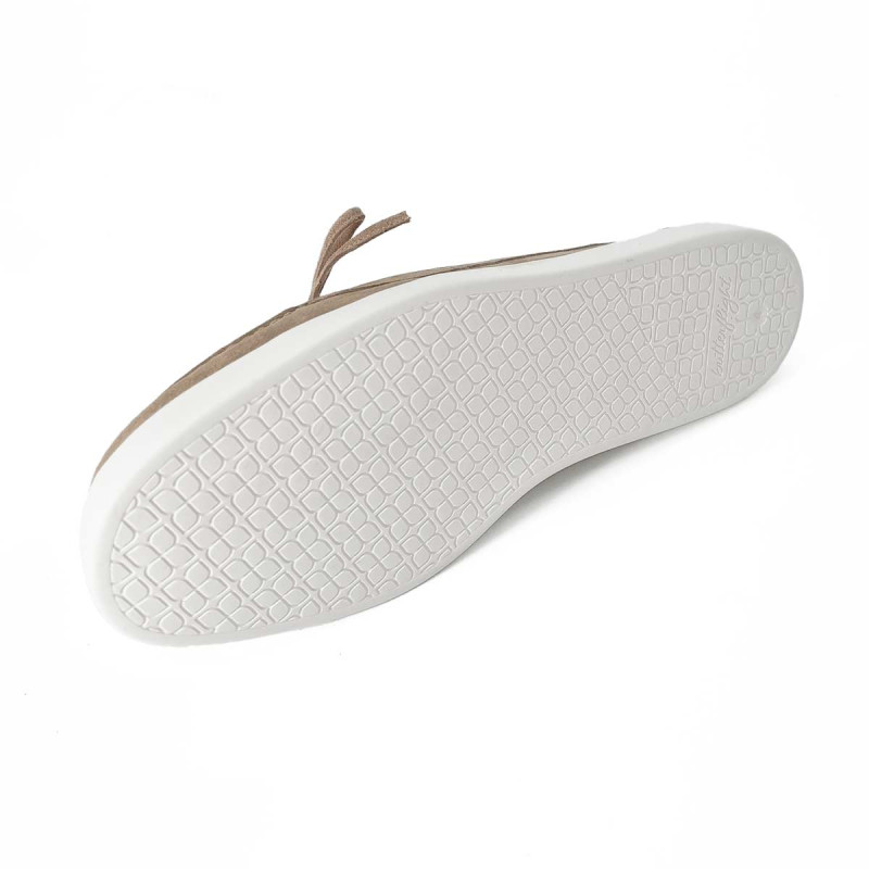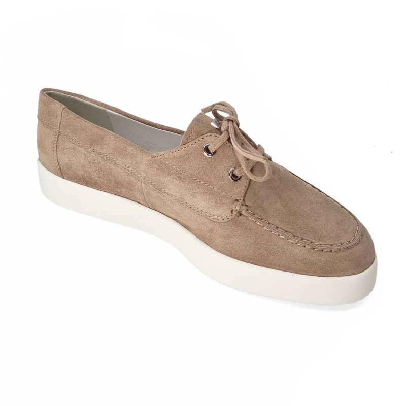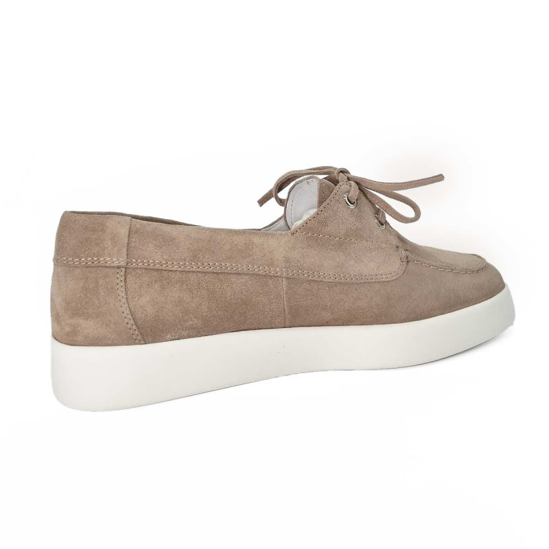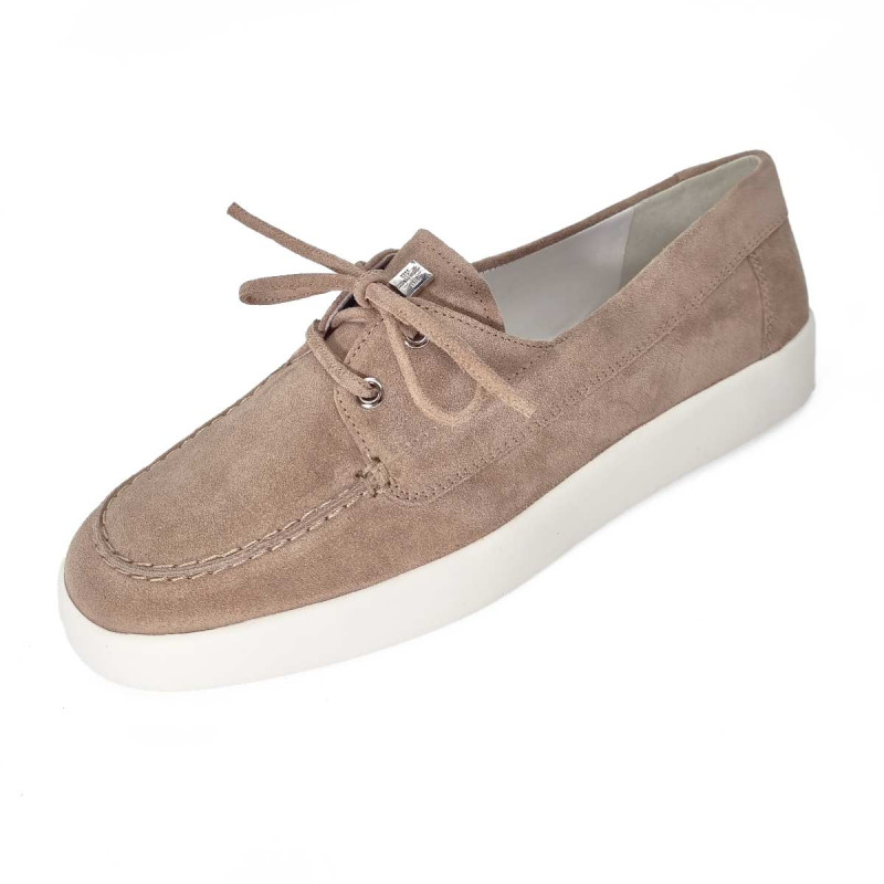 Mocassin bateau Högl en daim taupe avec semelle blanche et petits lacets sur le dessus. Confortable et élégant, il offre un style décontracté-chic idéal pour le quotidien et les tenues casual raffinées.