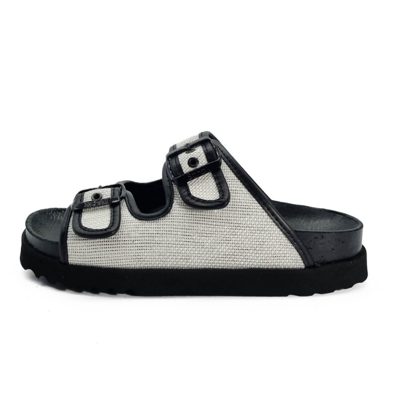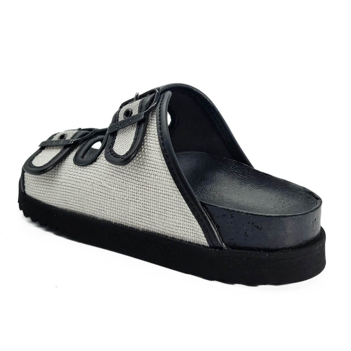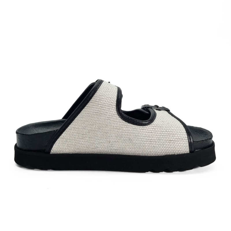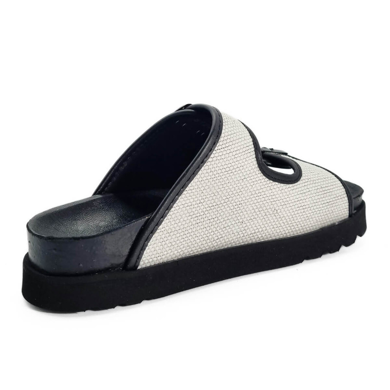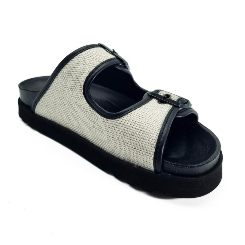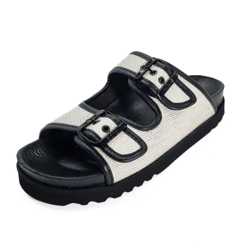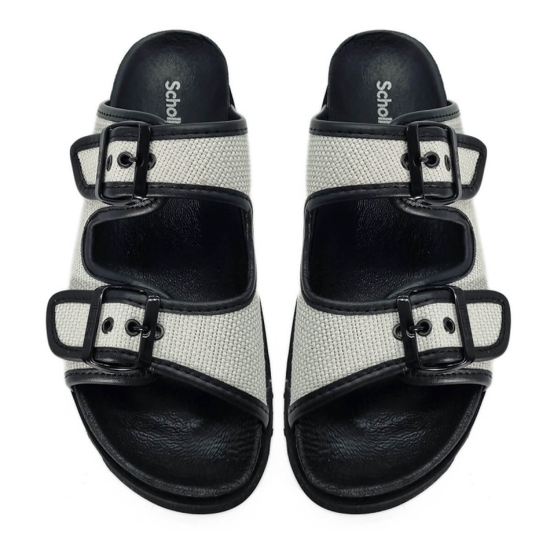 Alliant design sobre et confort emblématique, les sandales Juliette de Scholl se déclinent ici dans un élégant contraste de cuir noir et toile blanche. Leur silhouette minimaliste est rehaussée par deux brides réglables offrant un maintien personnalisé.