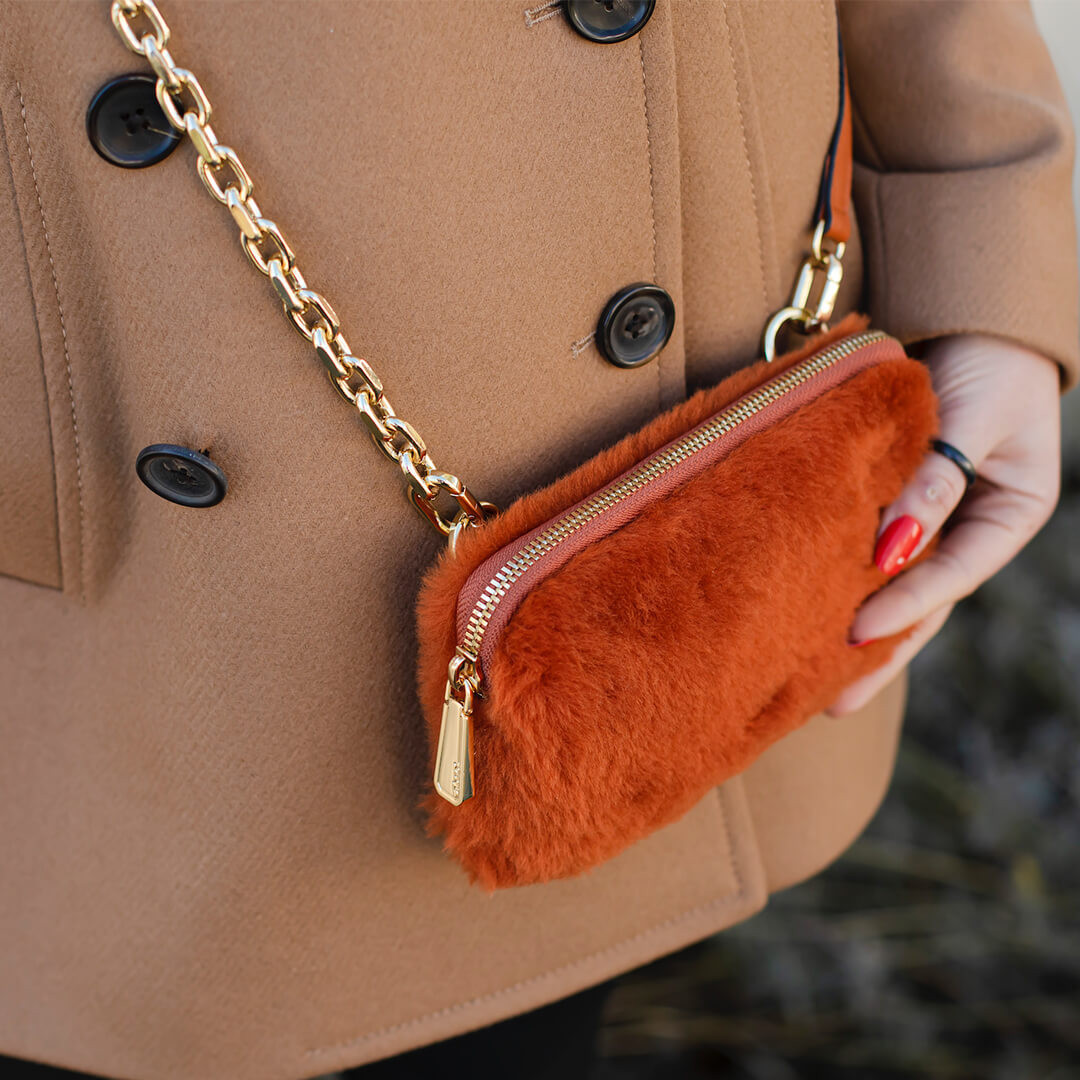 Adorable et super pratique, ce petit sac bandoulière en cuir et fourrure safran de la marque allemande Abro est votre nouvel indispensable de l'hiver.