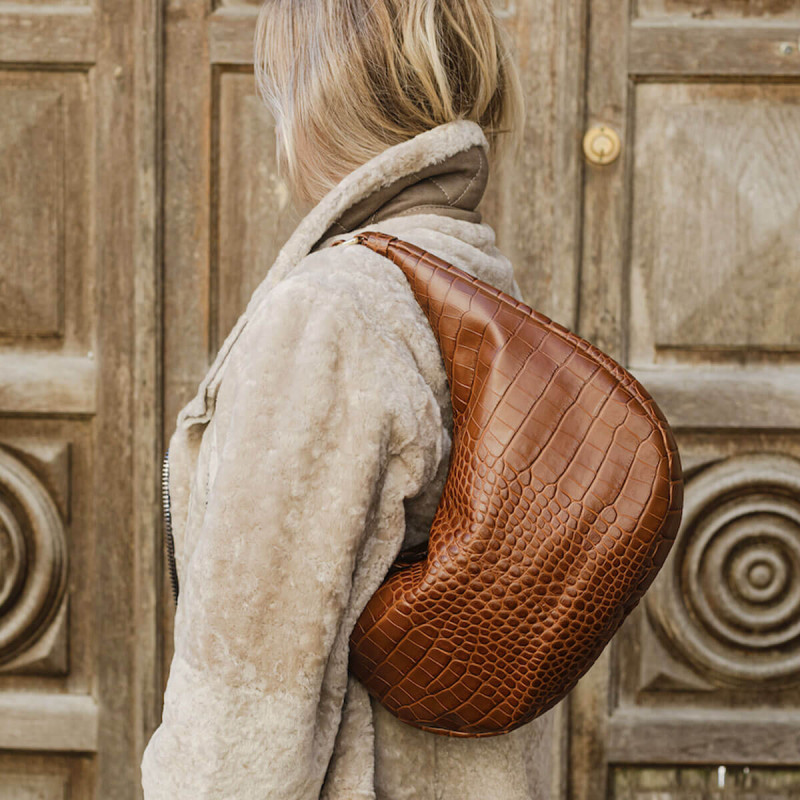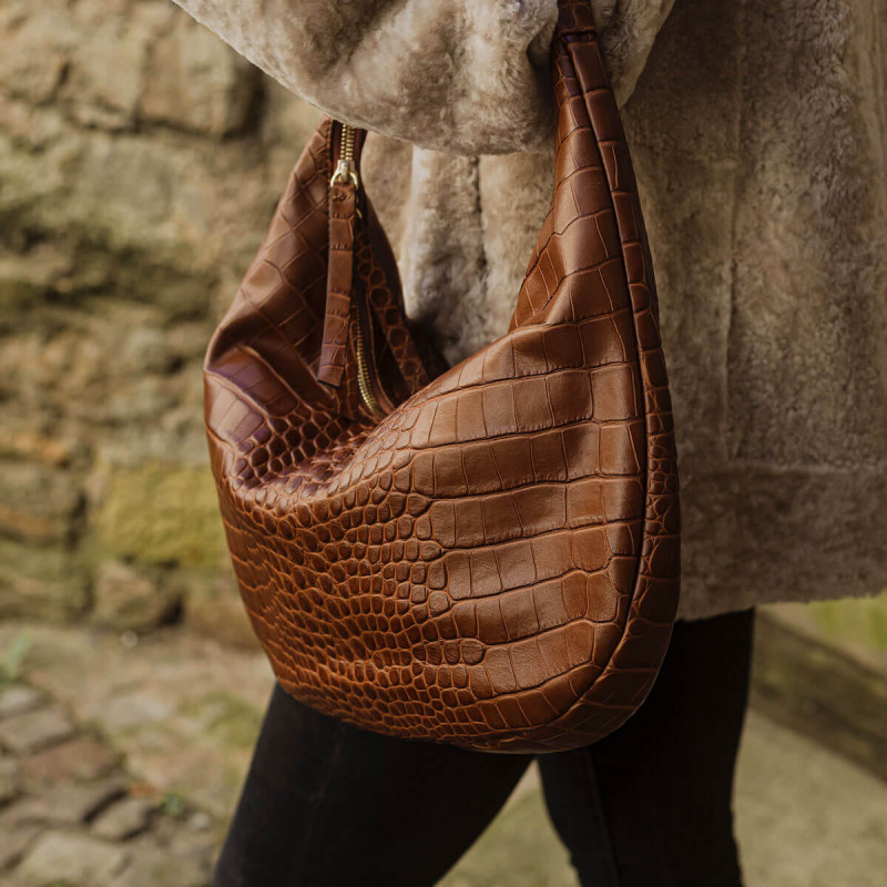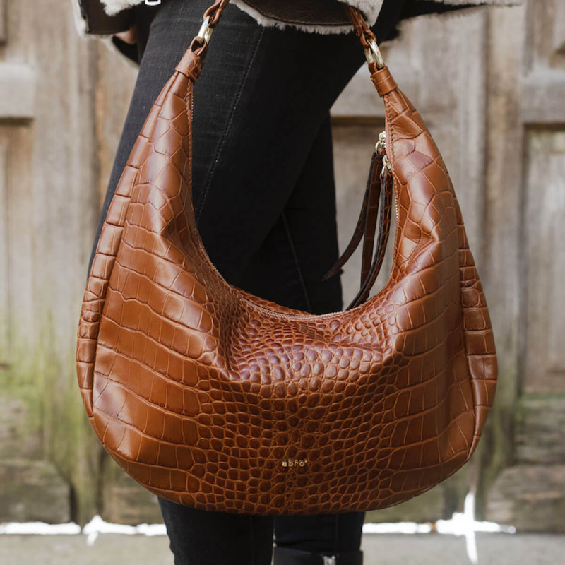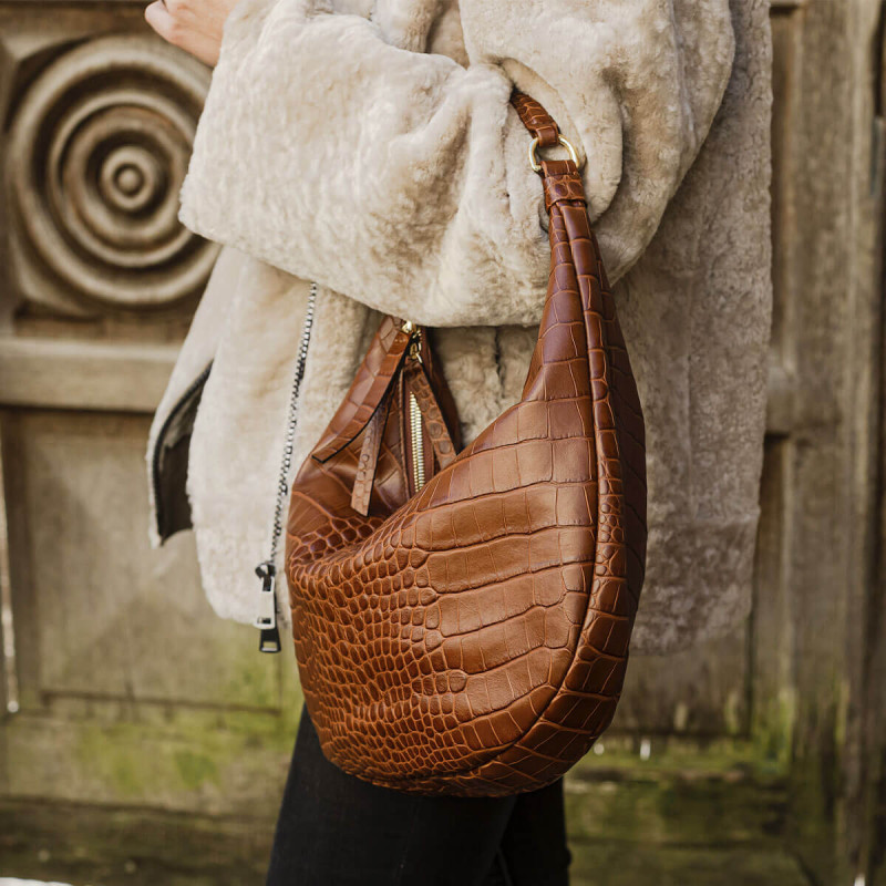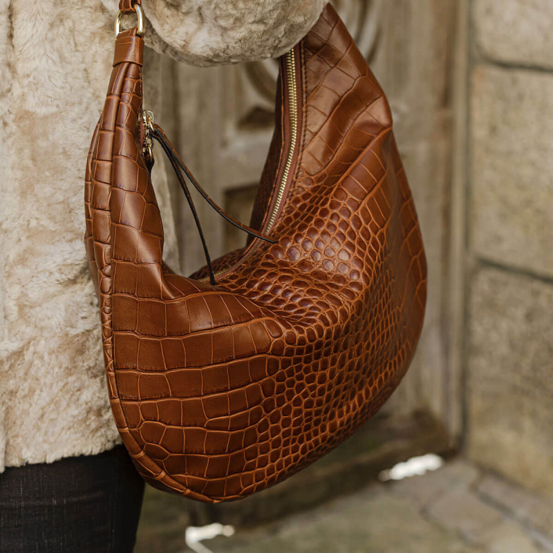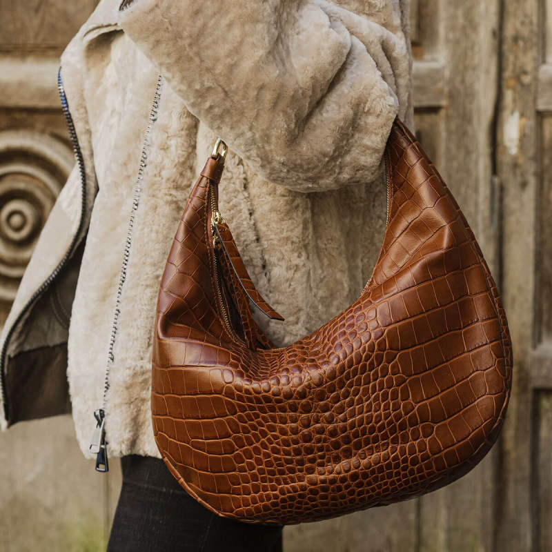 Ce sac à main en cuir croco marron séduit par sa forme demi-lune audacieuse. Sa texture impression croco en fait une pièce forte au caractère affirmé. Un accessoire irréprochable pour apporter singularité et élégance à vos looks.