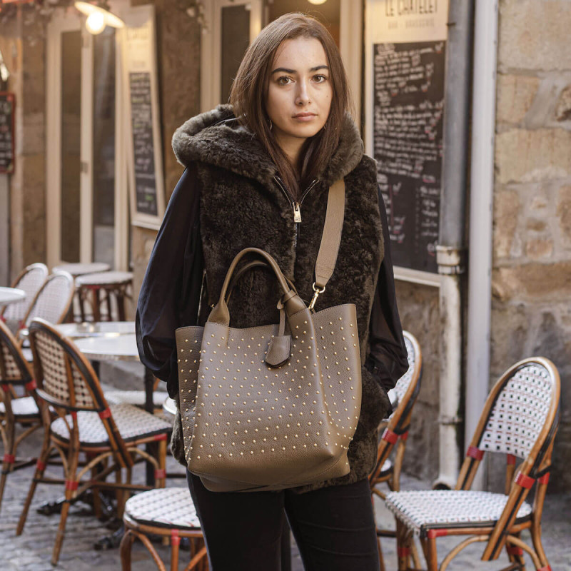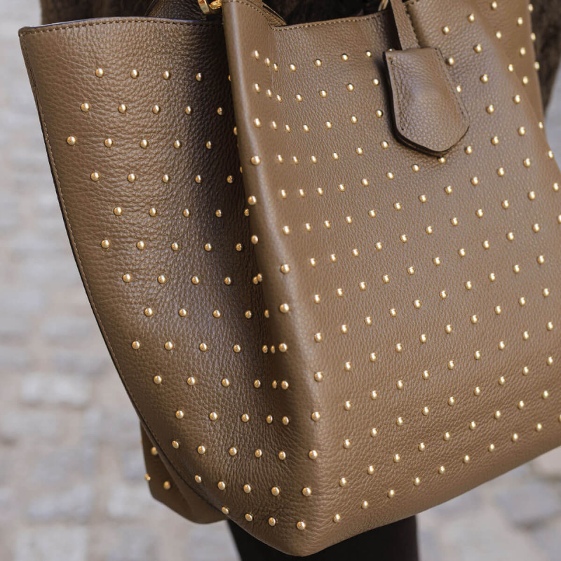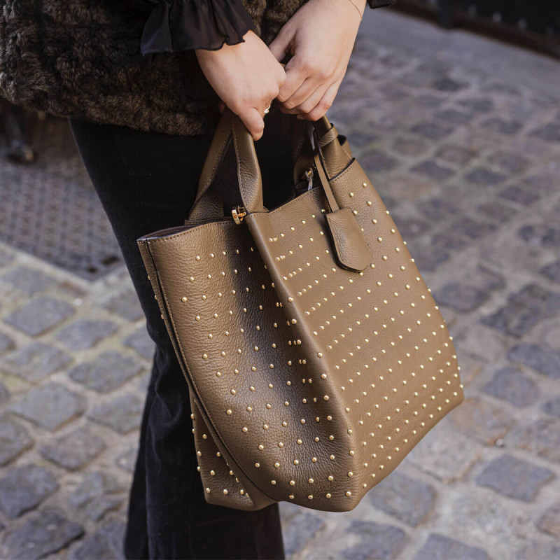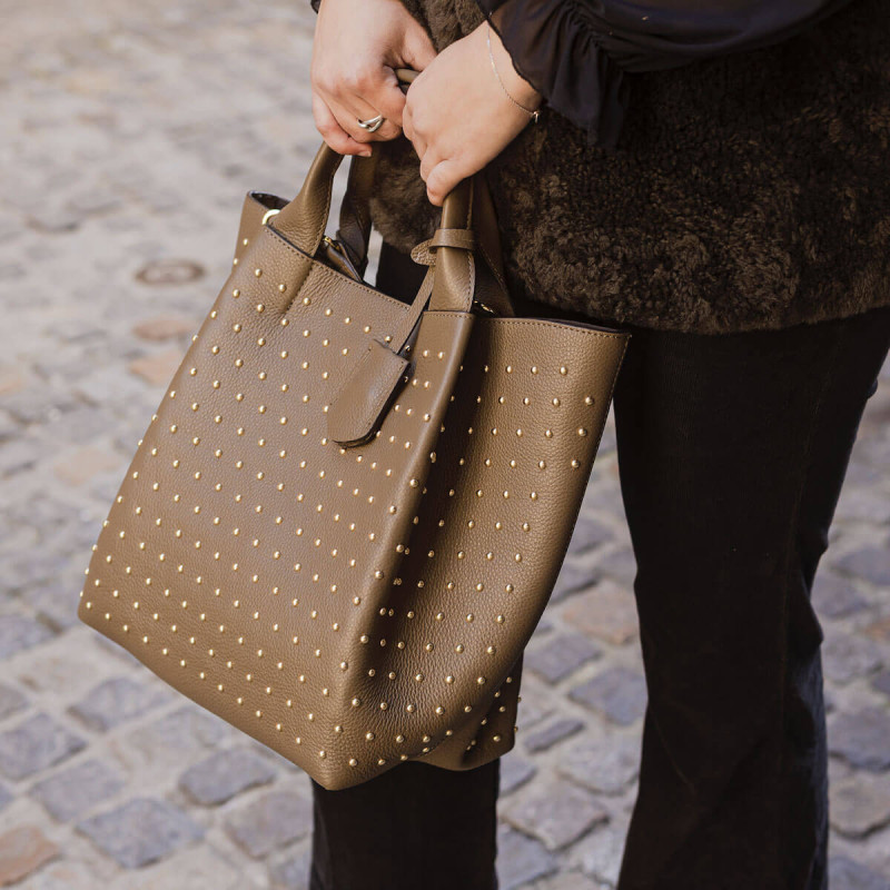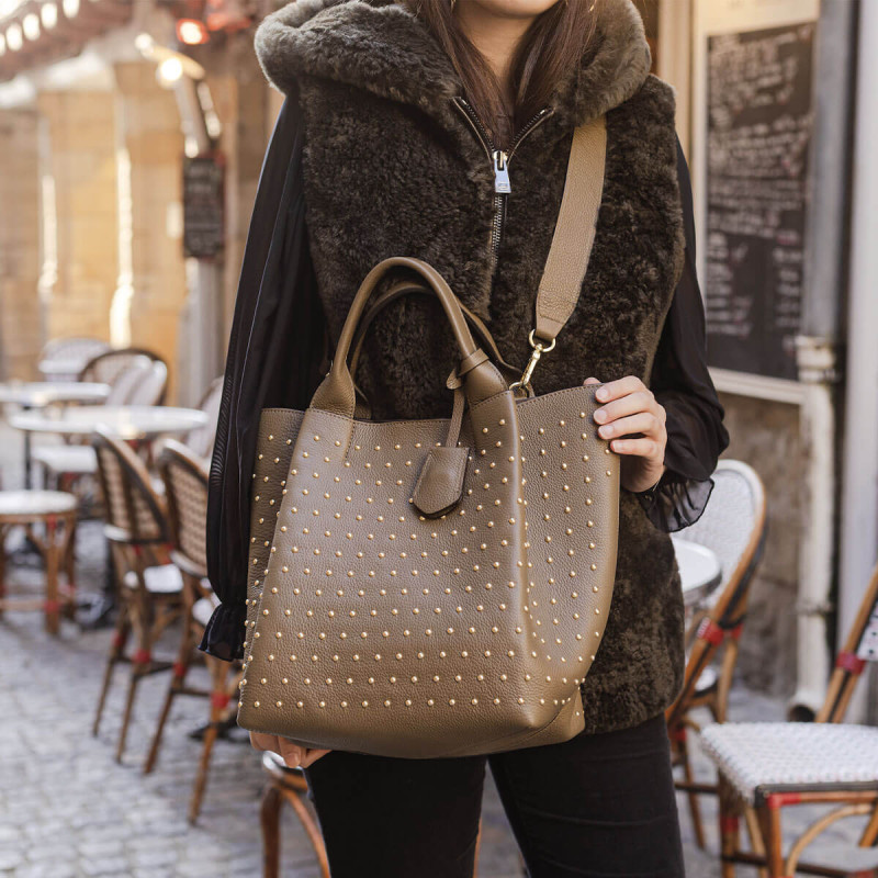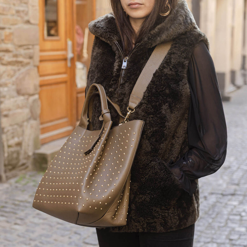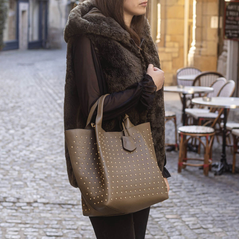 Abro revisite son cabas ENSSENTIAL en y ajoutant des clous dorés pour un esprit rock, mais toujours élégant. Son cuir kaki offre un style tendance, facile à assortir. Un modèle pratique qui apporte caractère à votre dressing.