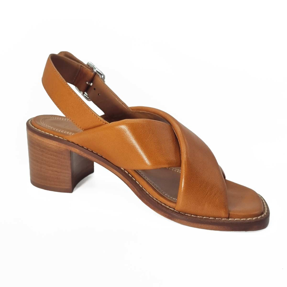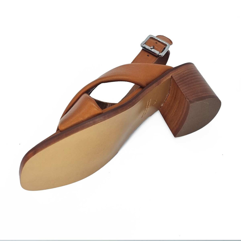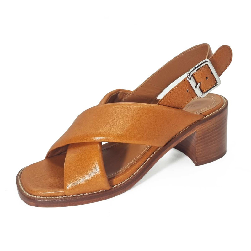 Cette sandale à talon en cuir camel incarne une élégance naturelle. Sa ligne épurée met en valeur le pied tandis que son talon apporte une silhouette féminine et raffinée. Une pièce idéale pour accompagner robes et tenues estivales.