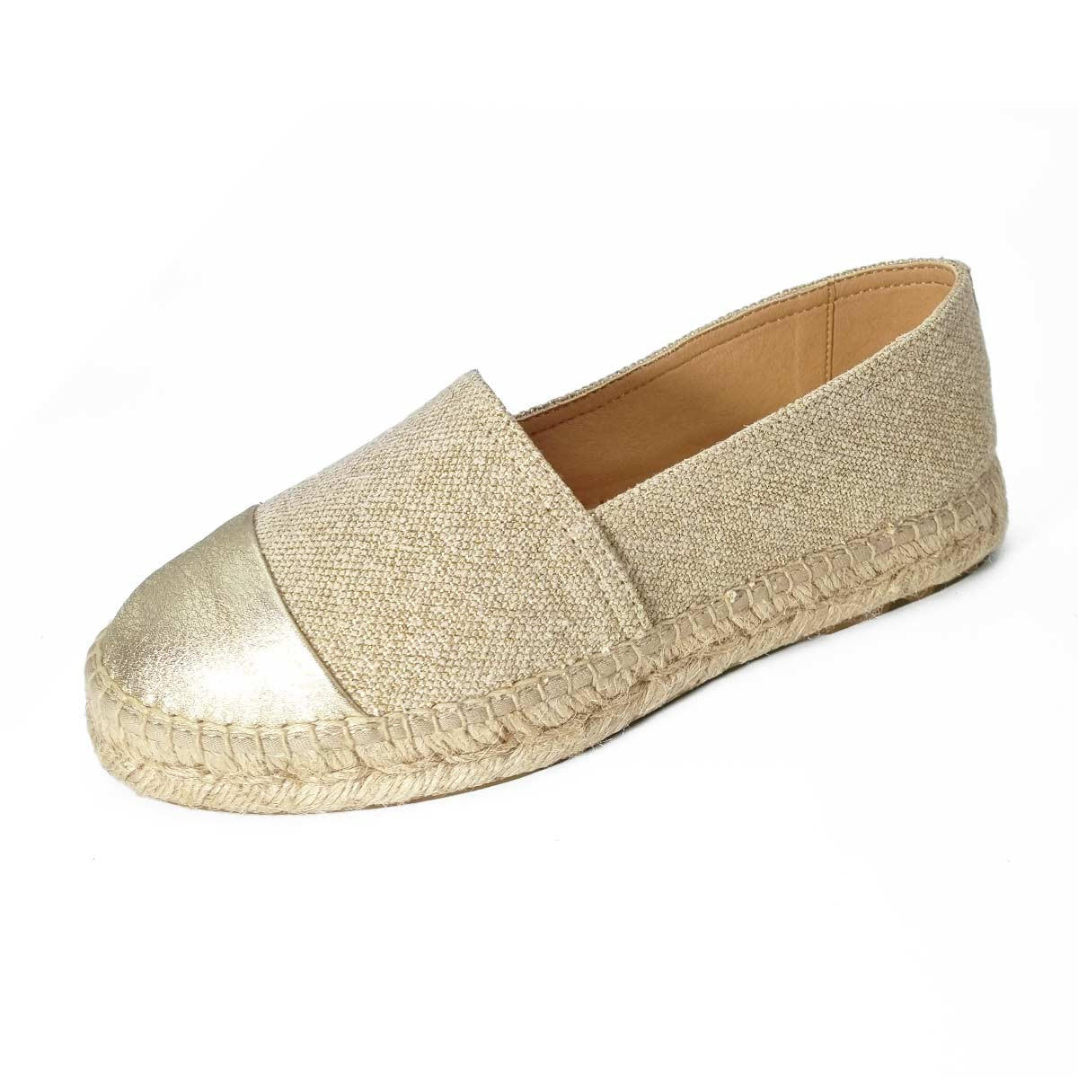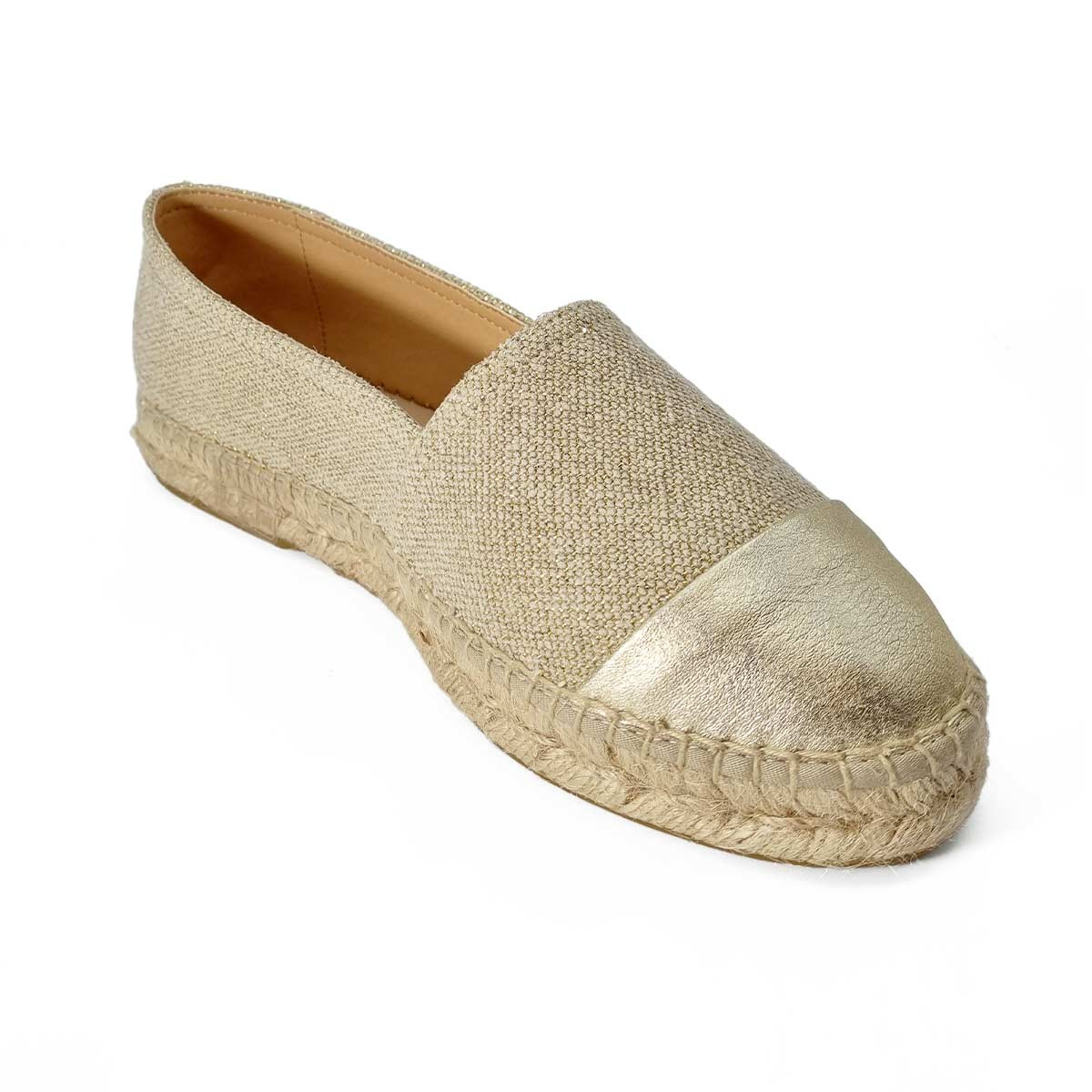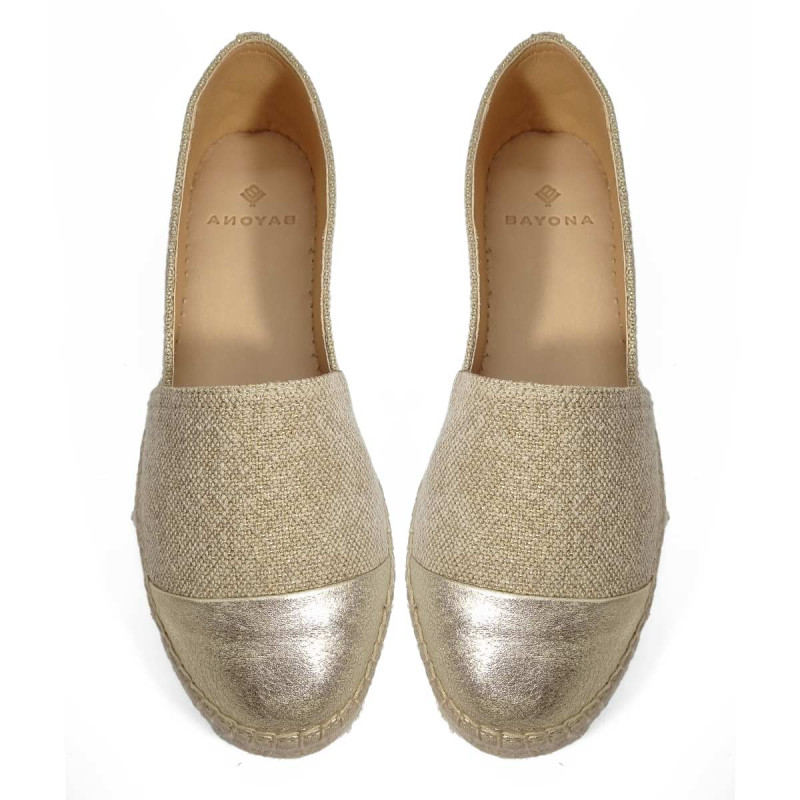 L’espadrille Bayona New York allie raffinement et légèreté. Sa tige en lin aux reflets dorés et son intérieur cuir apportent élégance et confort au quotidien, avec une silhouette fine et équilibrée.