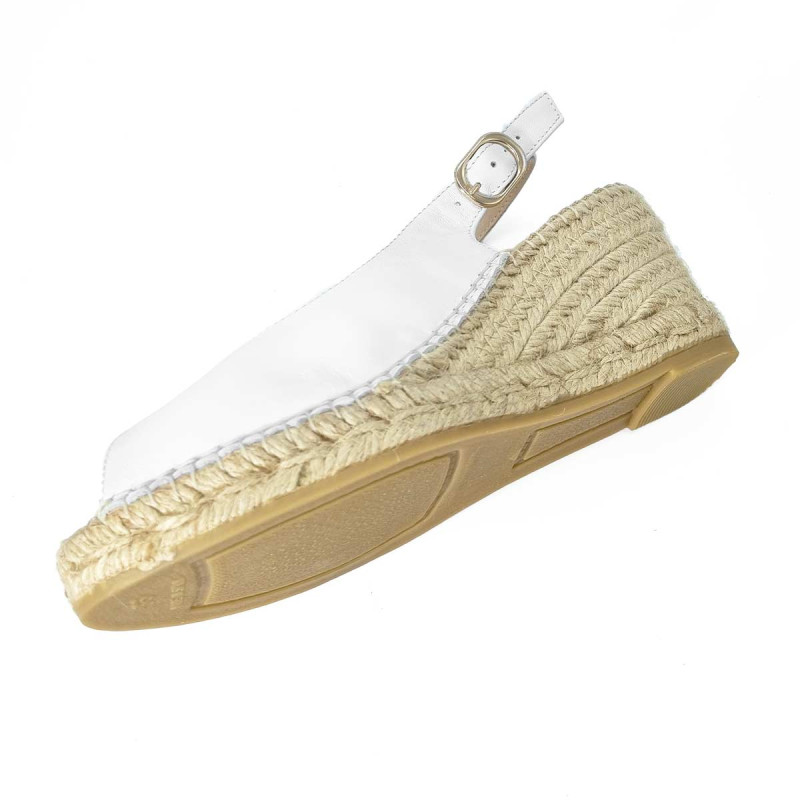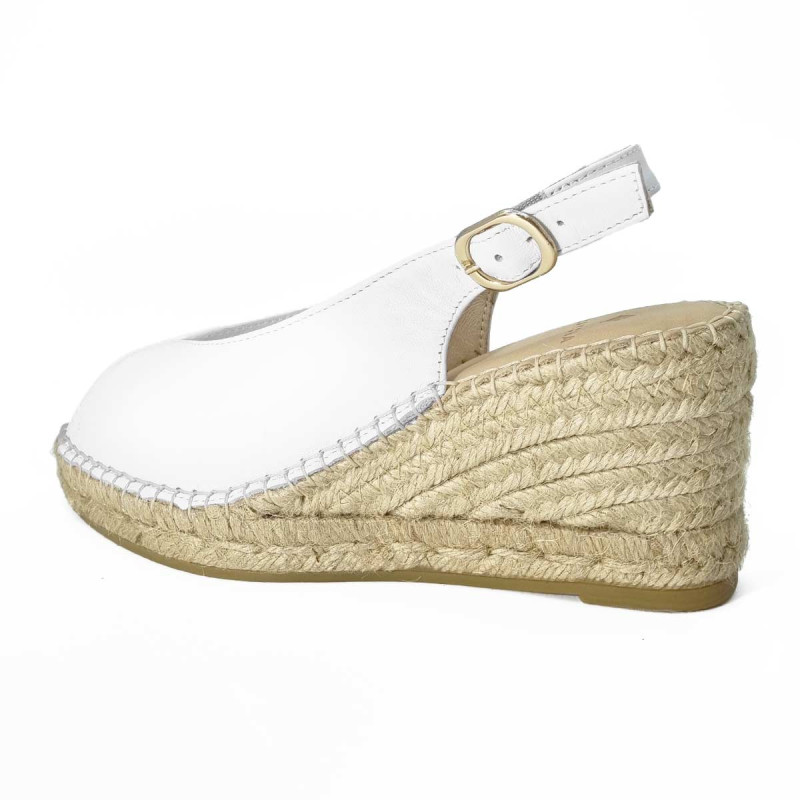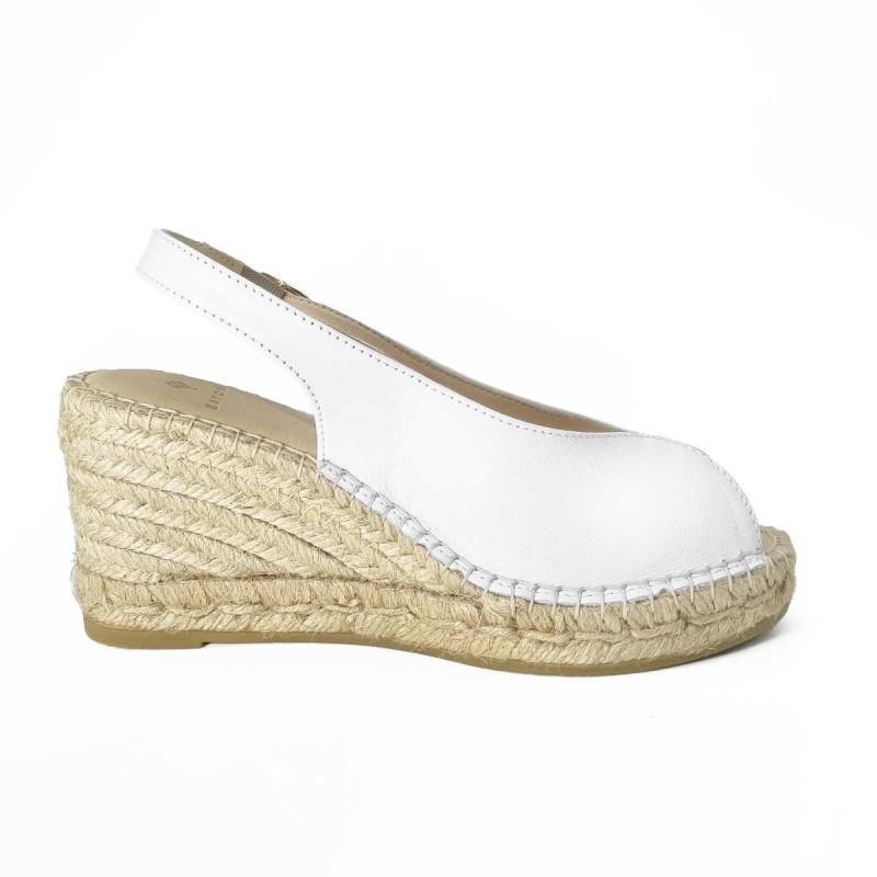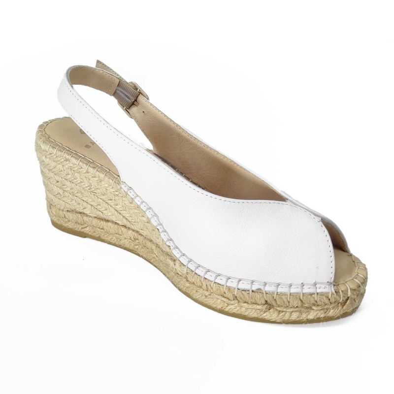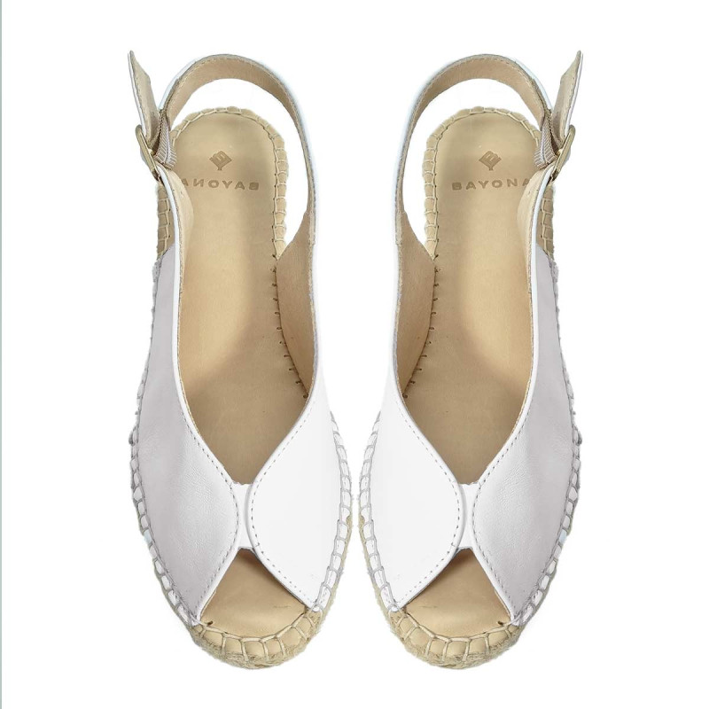 Espadrille compensée Bayona Elda 5 en cuir blanc, à la silhouette élancée et contemporaine. Son design raffiné offre une hauteur maîtrisée tout en sublimant la jambe, pour un look féminin chic et facile à porter.