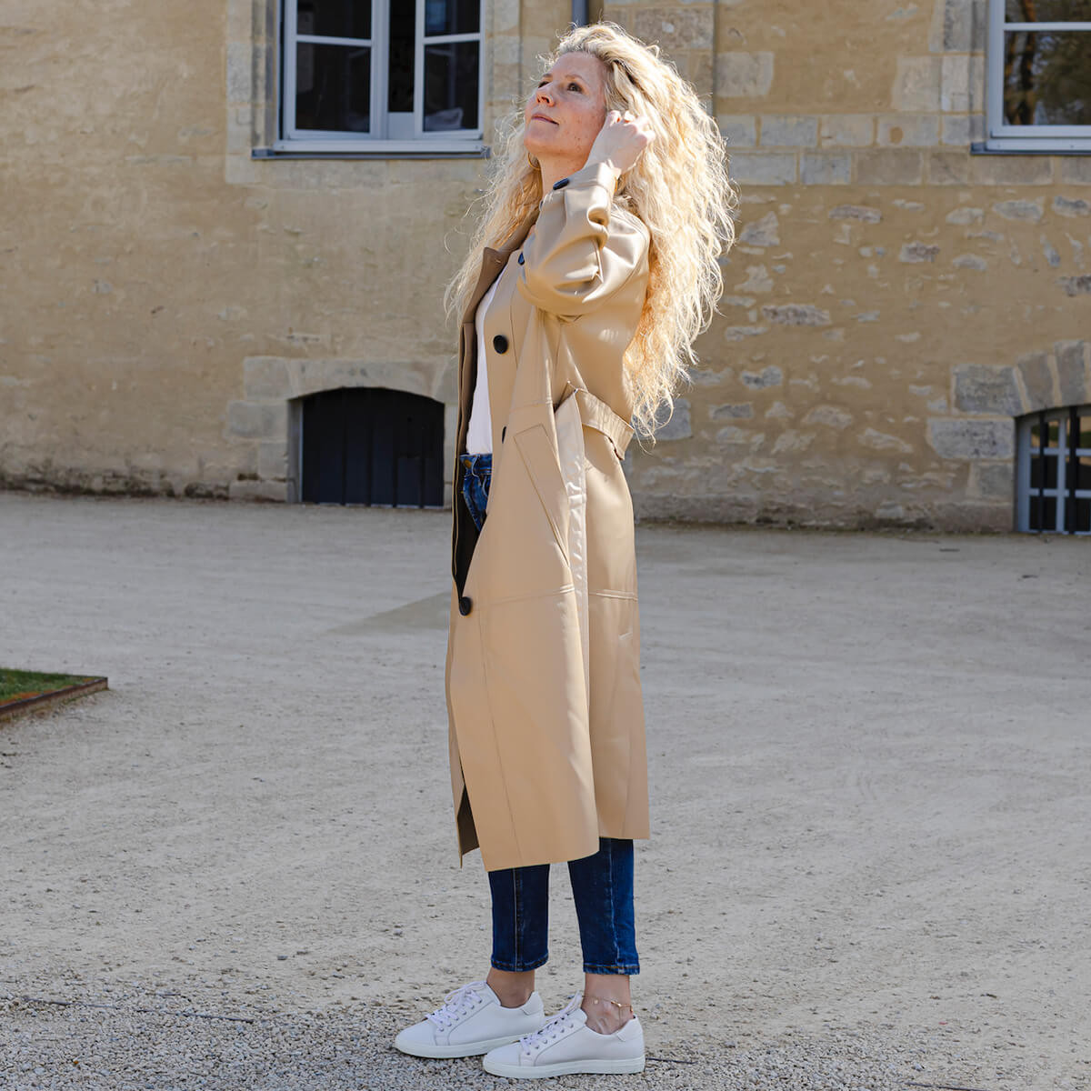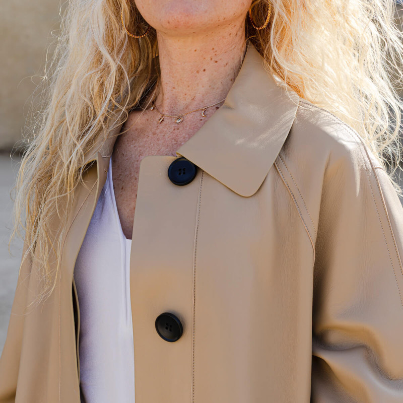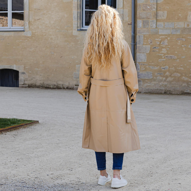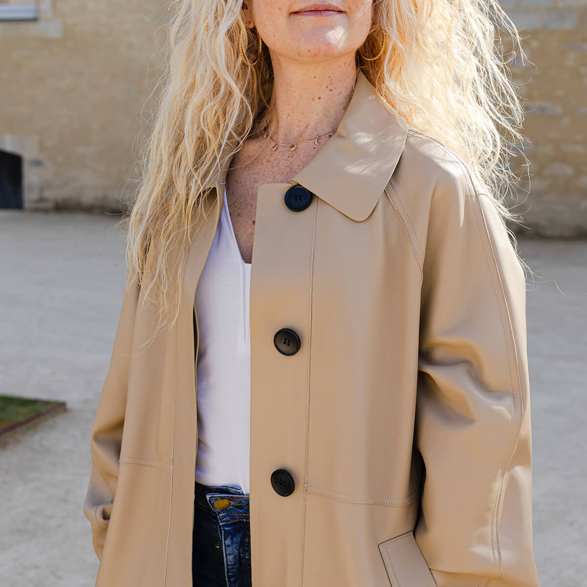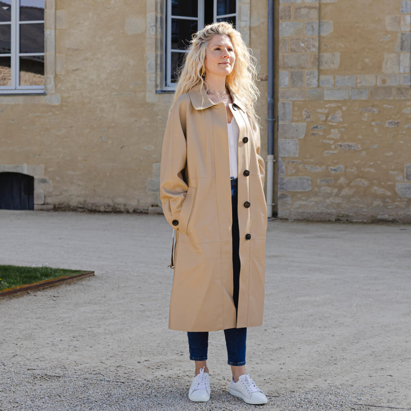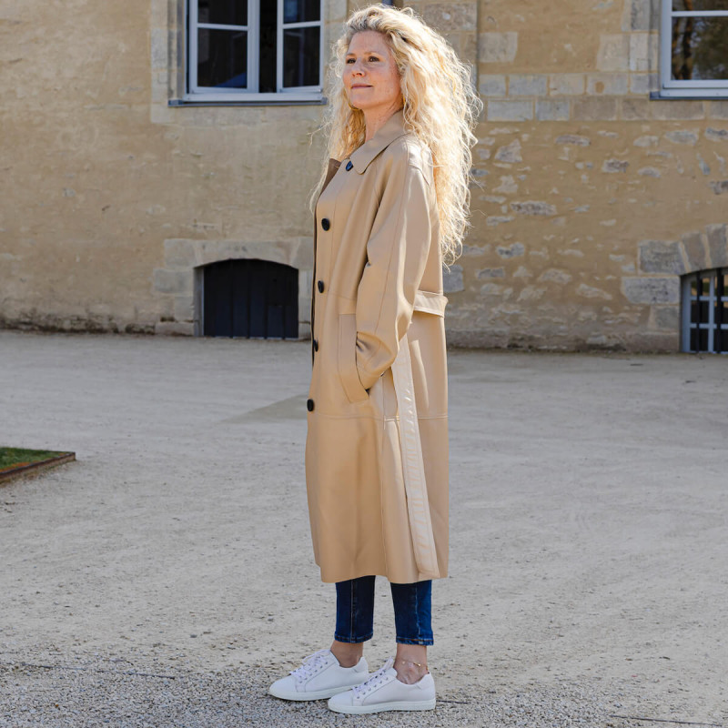Ce trench en cuir d'agneau beige, d'une souplesse et d'une légèreté incomparables, incarne l’élégance naturelle à la française. Son col arrondi apporte une touche de douceur à sa ligne épurée, tandis que les boutons noirs, choisis pour contraster avec finesse, soulignent son caractère affirmé.